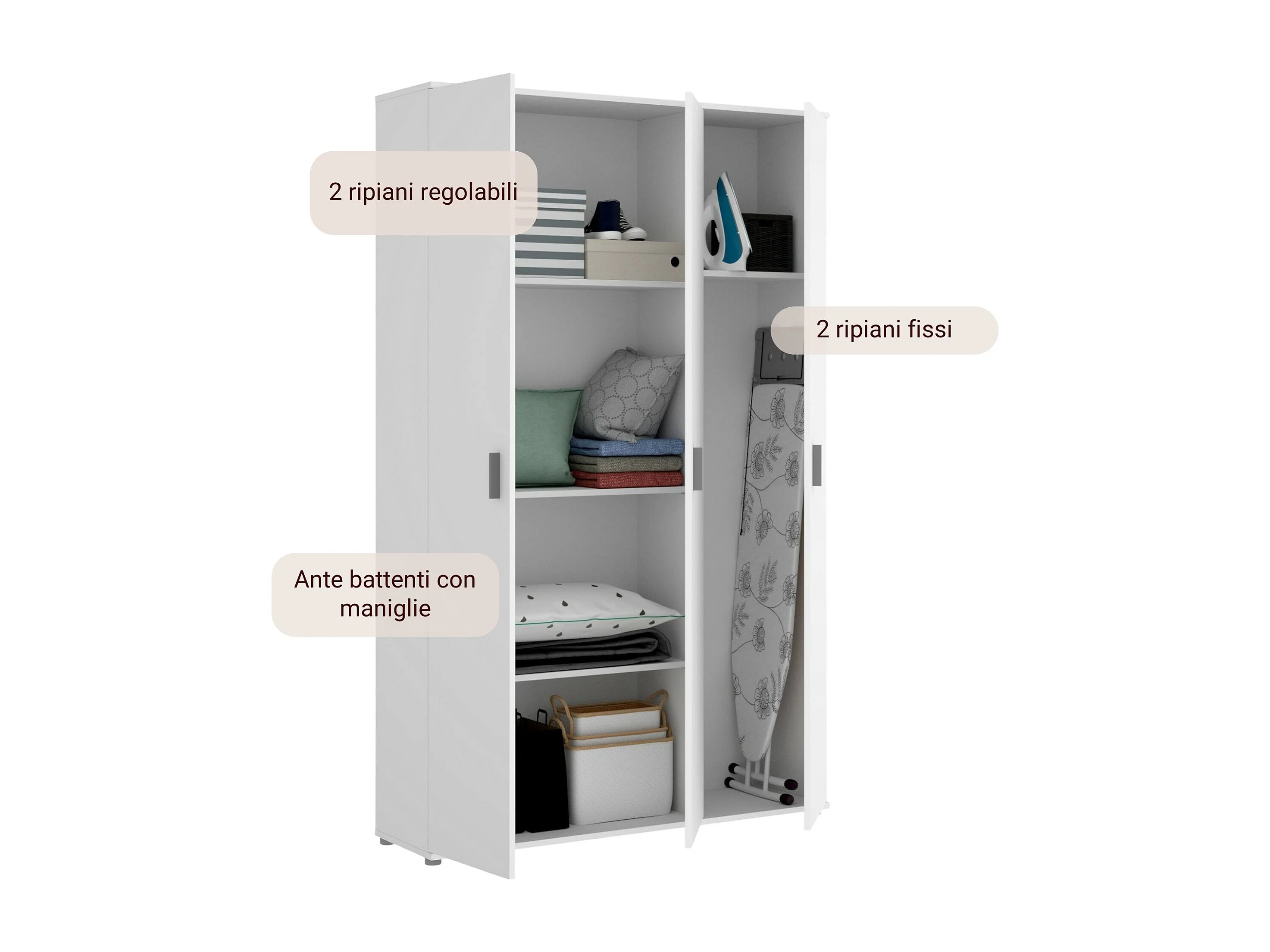 Armoire polyvalente Sillano, Armoire porte-balai multifonctionnelle, armoire 3 portes, 116x35h190 cm, Blanc