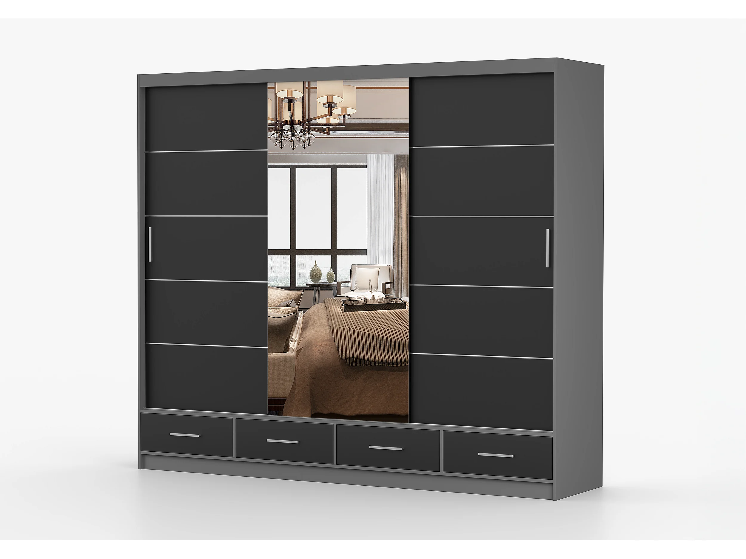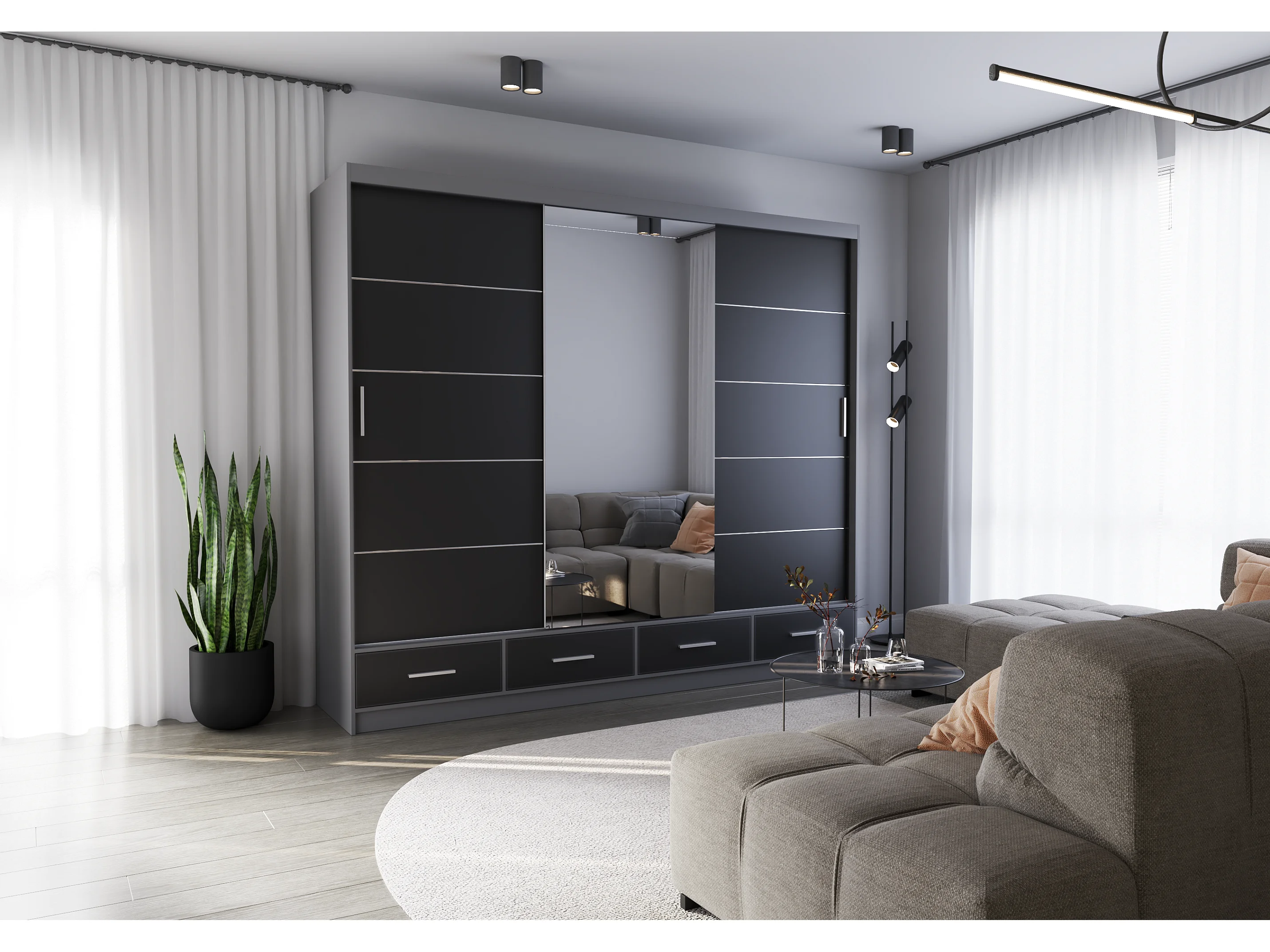 Armoire Silas 250 cm avec miroir - Gris - Noir