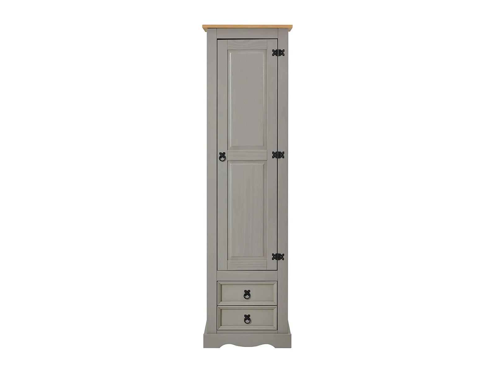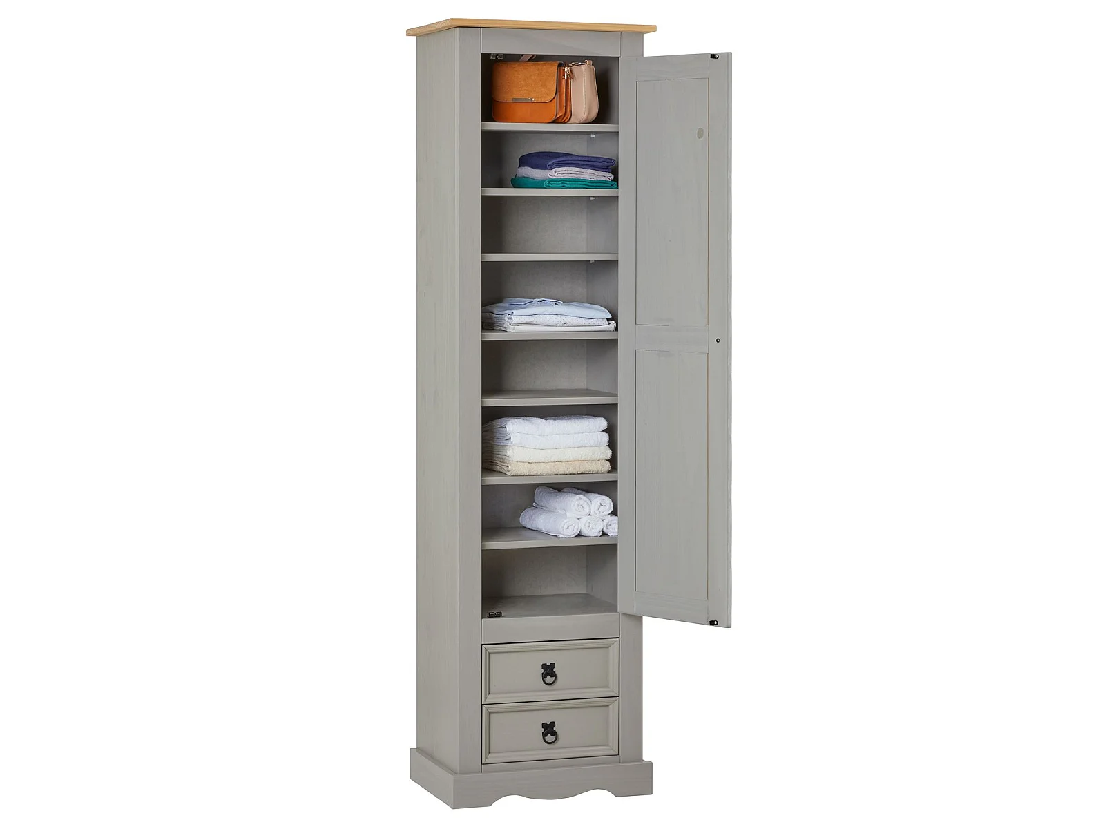 Armoire TEQUILA meuble de rangement avec 7 tablettes derrière 1 porte battante et 2 tiroirs, en pin massif lasuré gris et brun