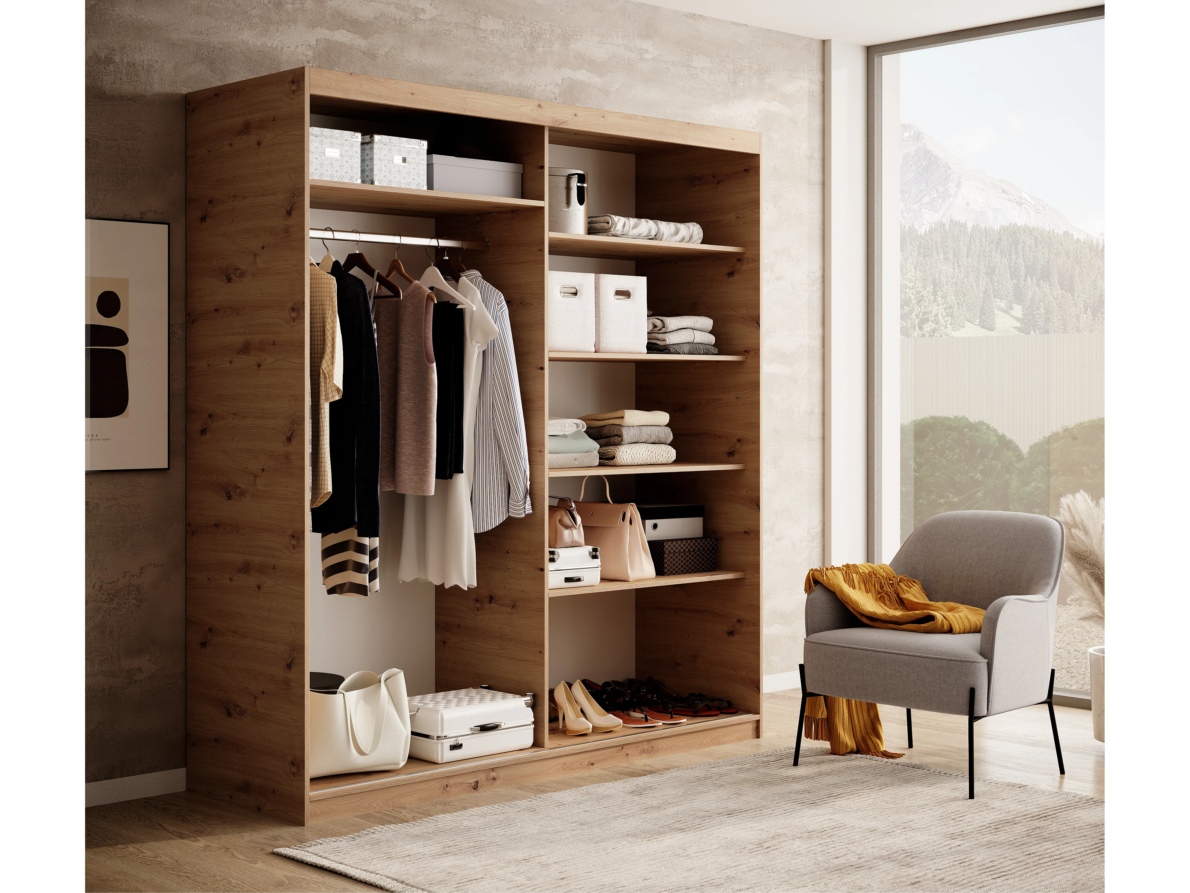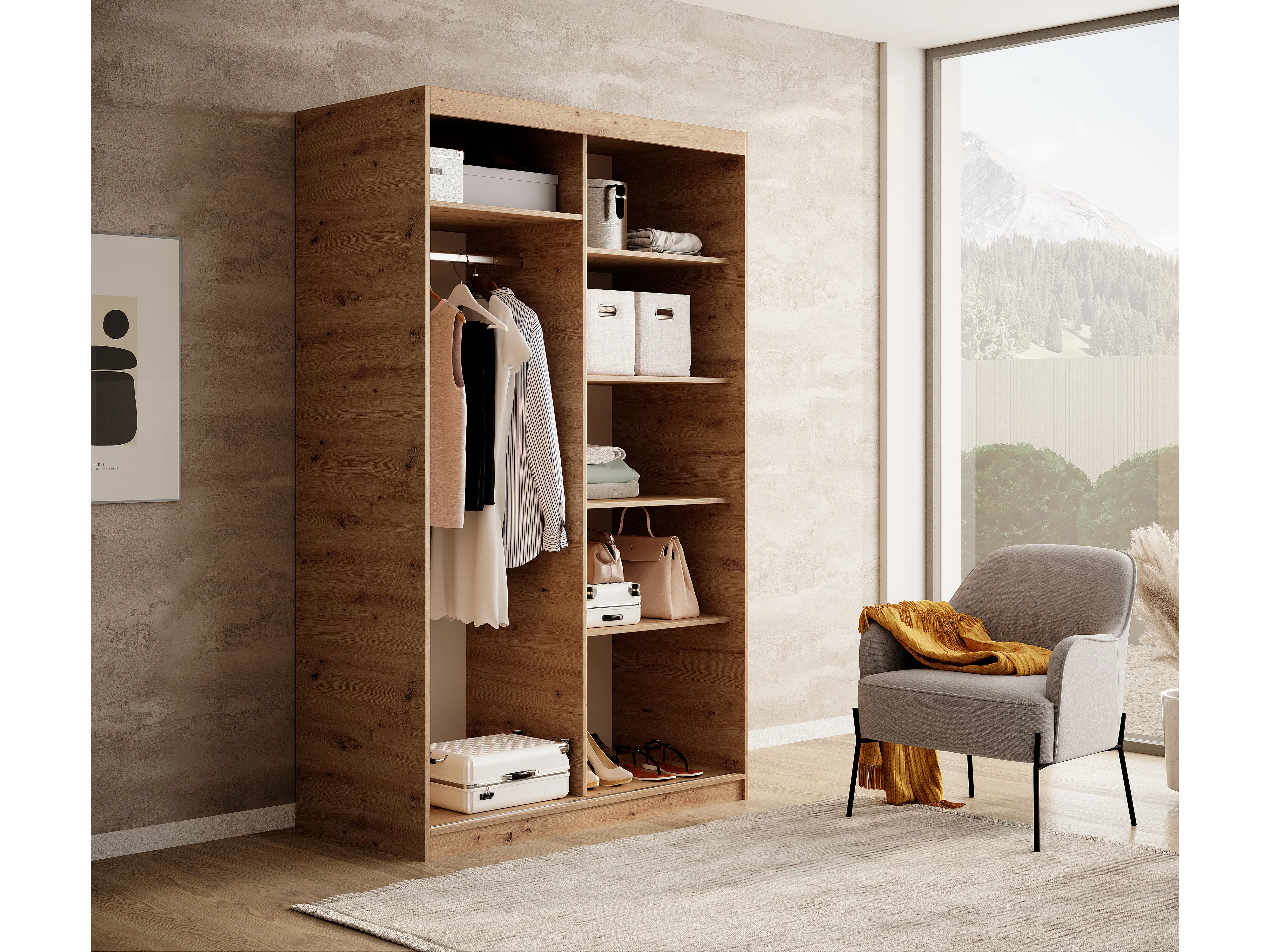 Armoire coulissante BIZEN avec lames décor bois et miroir – Moderne et chaleureux-Beige-Largeur 120 cm