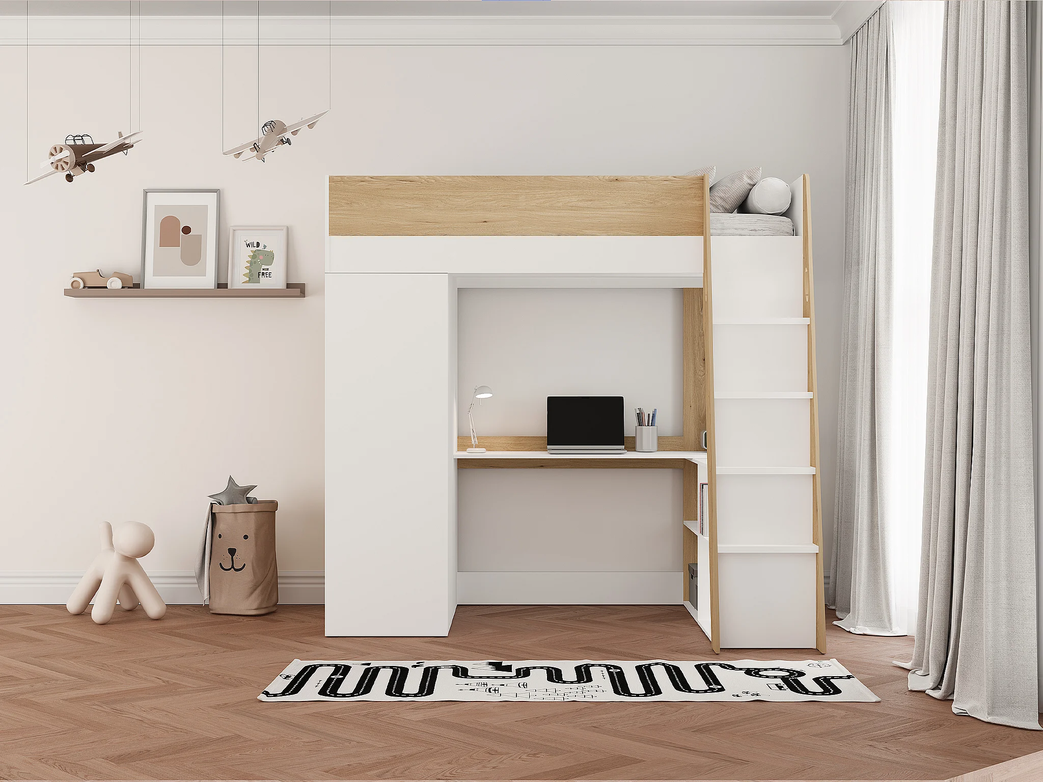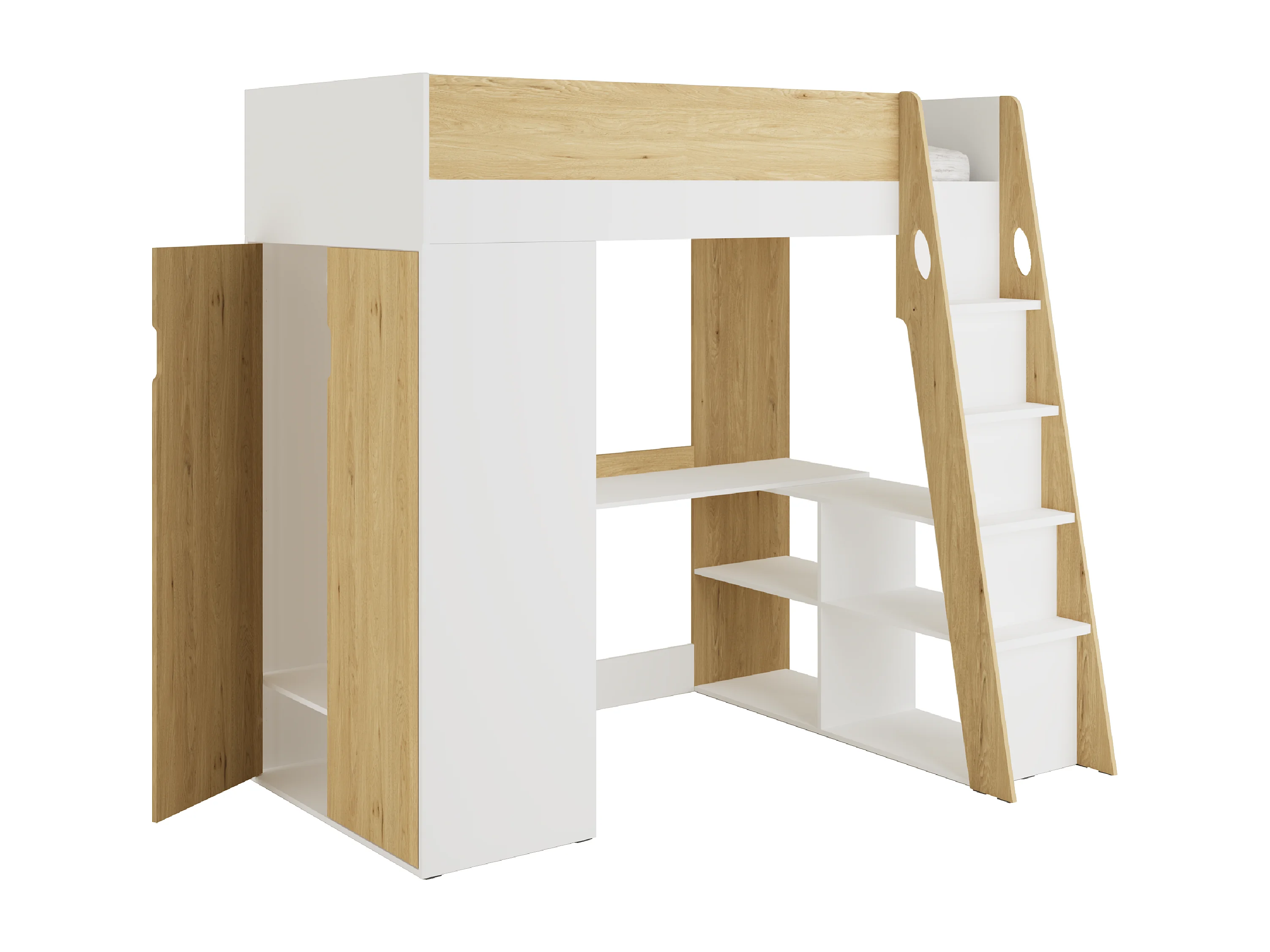 Lit mezzanine 90 x 190 cm avec armoire et bureau – Coloris : Naturel et blanc - ARMONESA