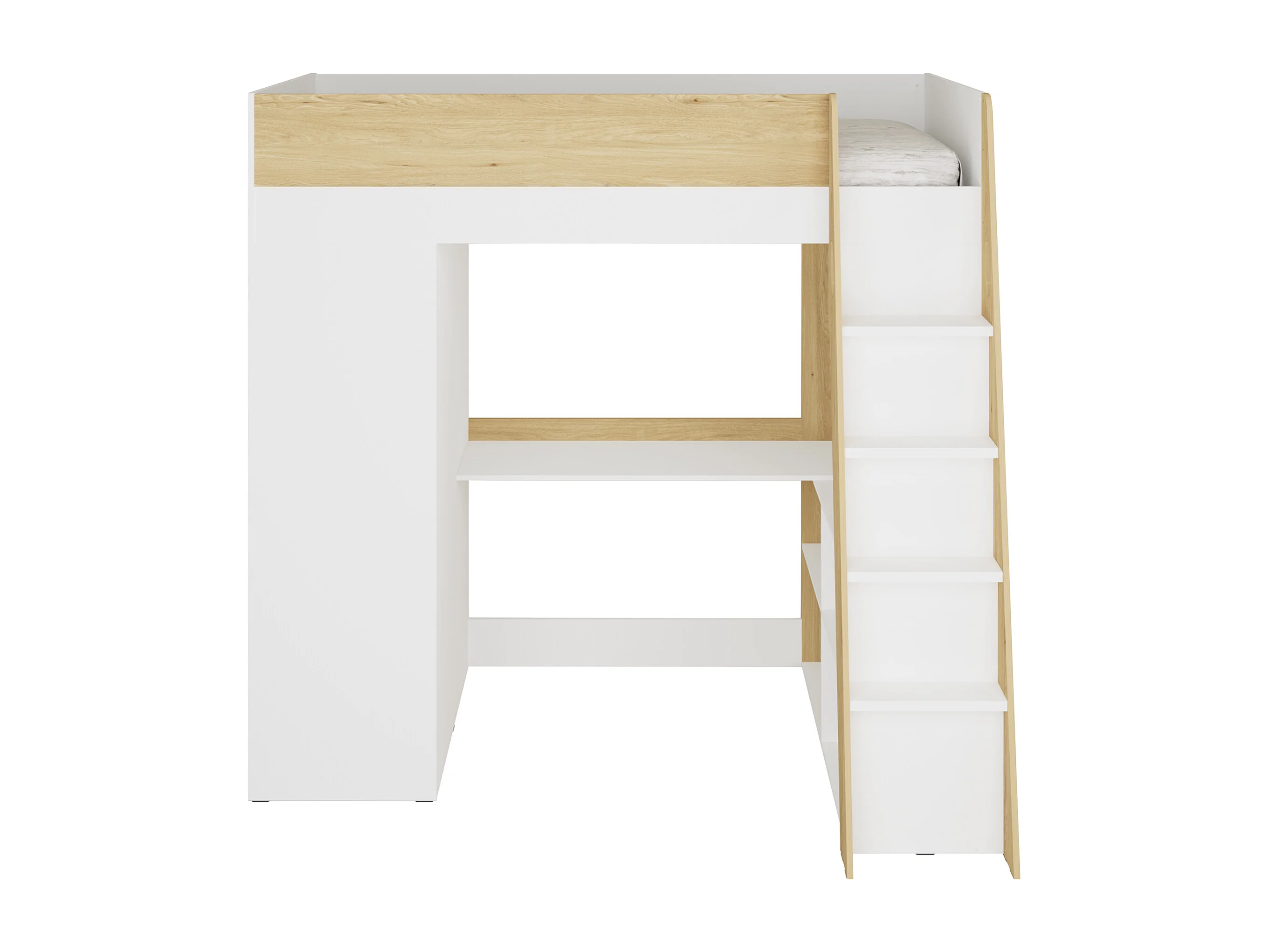 Lit mezzanine 90 x 190 cm avec armoire et bureau – Coloris : Naturel et blanc + Matelas - ARMONESA