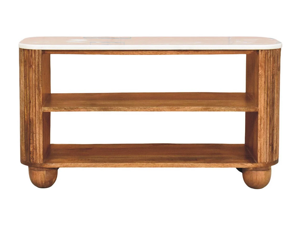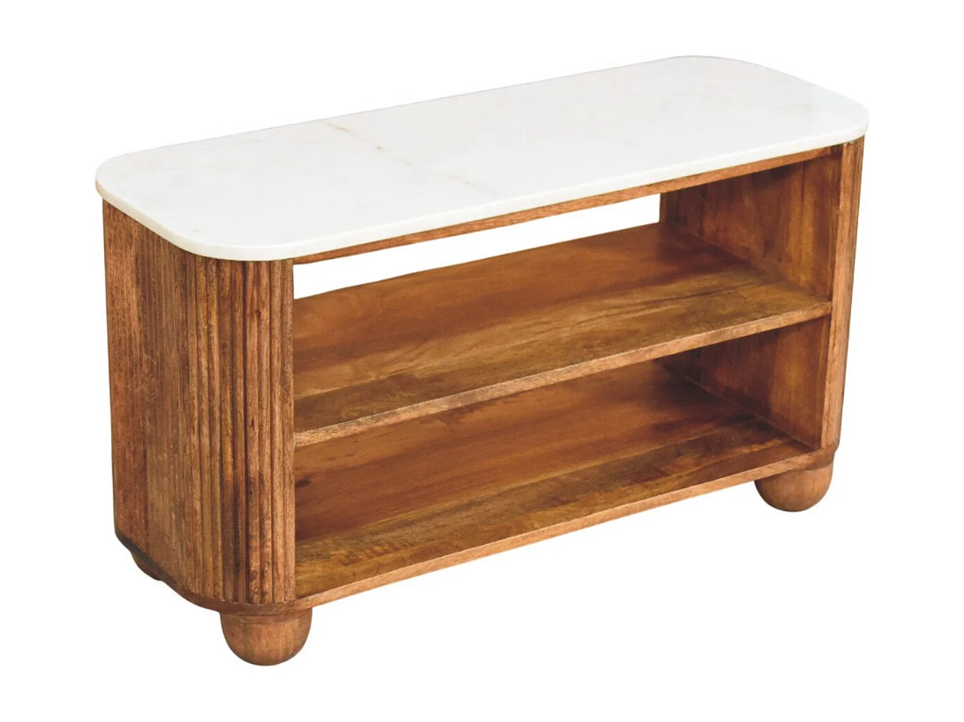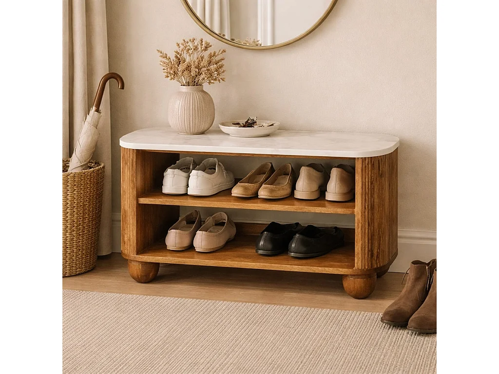 Artisan Furniture Banc à chaussures Beunumont en bois massif de manguier, plateau en marbre, deux étagères ouvertes, marron.