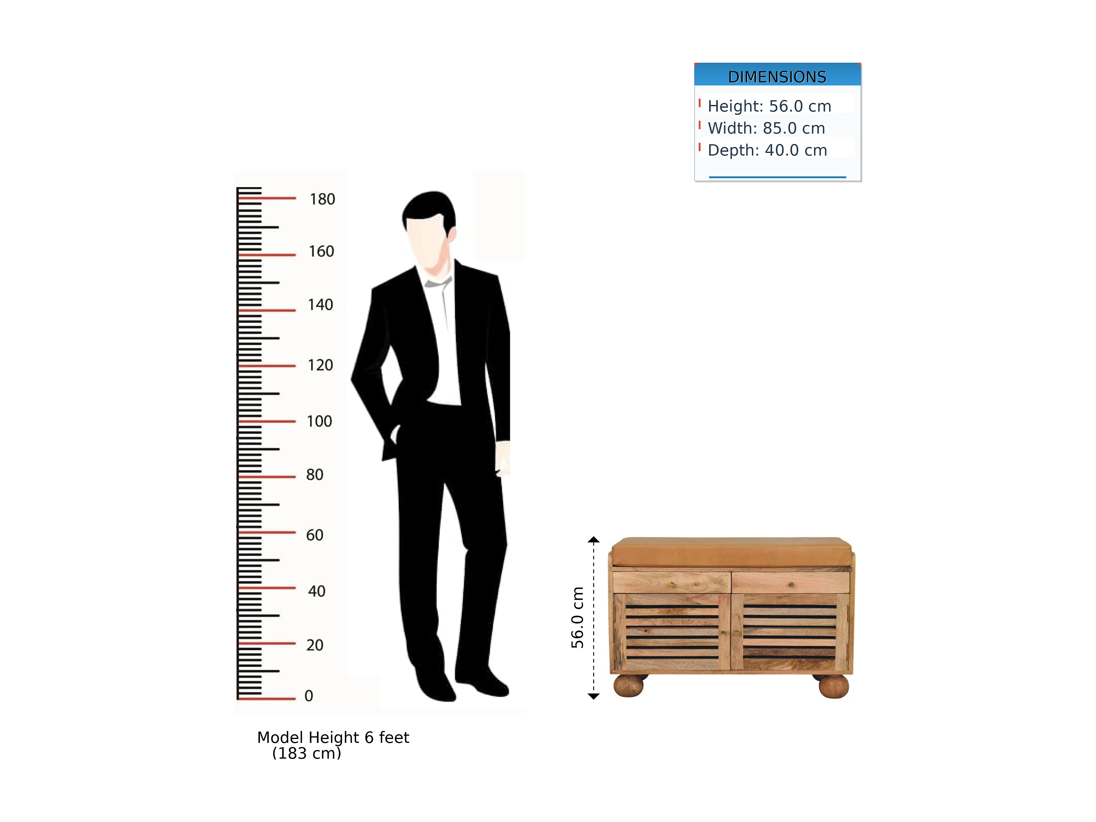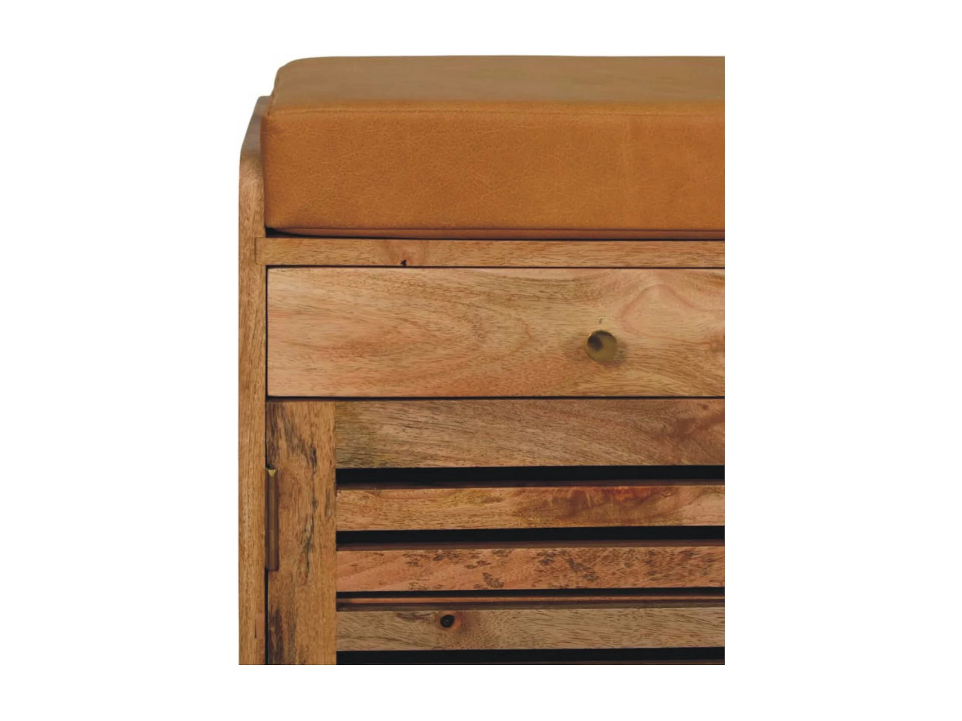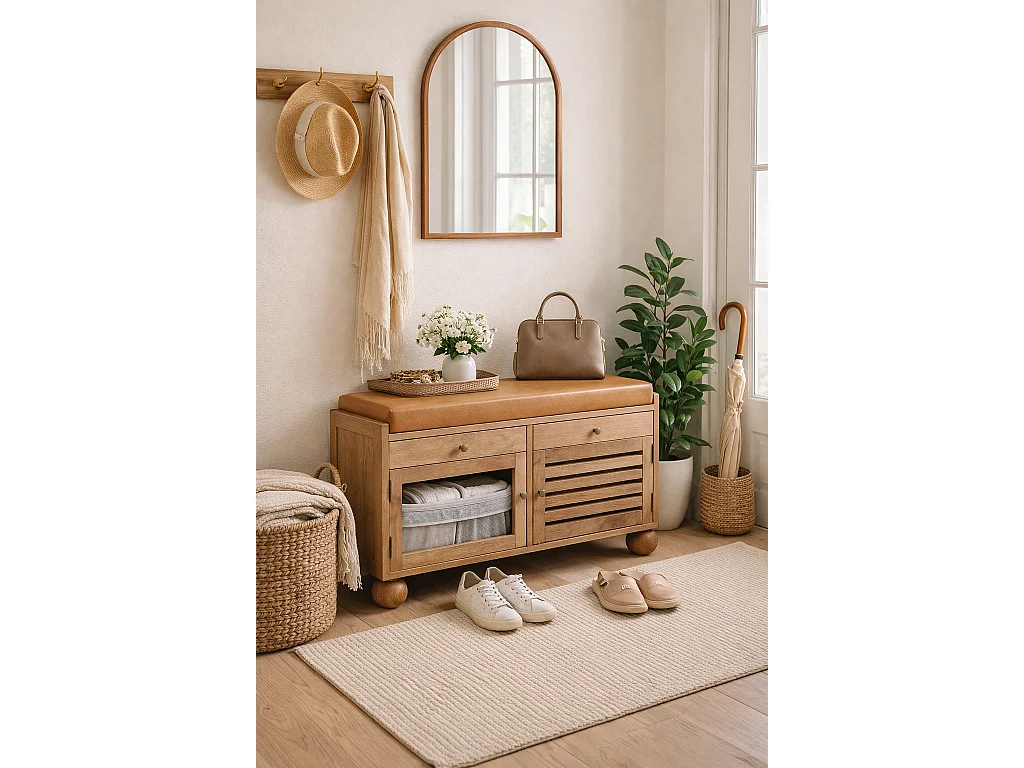 Artisan Furniture Meuble à chaussures Shutter Oak-ish, bois massif, 2 tiroirs, 4 étagères, 2 portes et assise rembourrée en cuir, brun chaud
