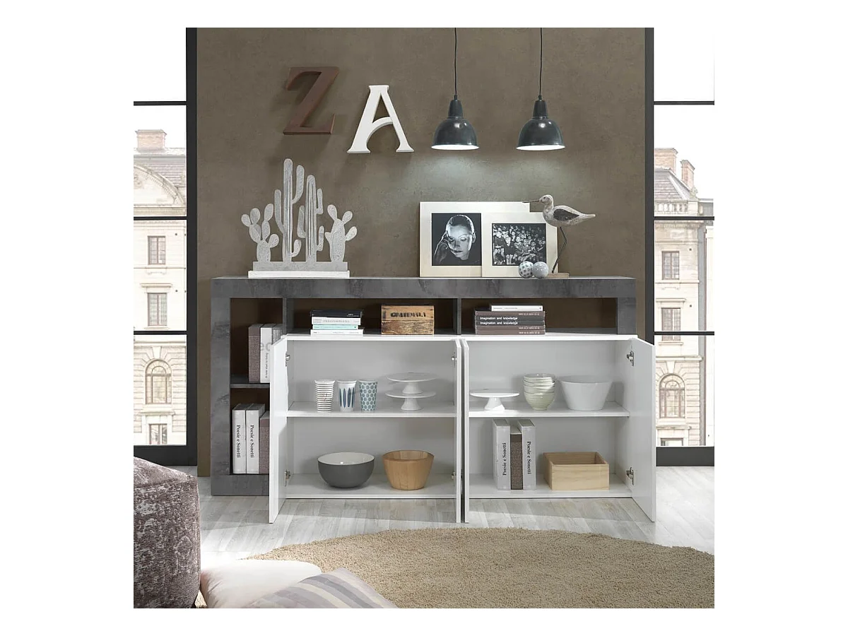 ARTURO - Buffet 4 Portes Blanc Laqué Encadrement Niches Aspect Gris Oxyde