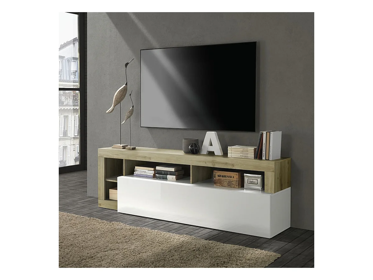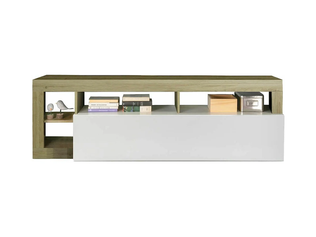 ARTURO - Meuble TV 1 Abattant Blanc Laqué Encadrement Niches Aspect Bois Cadiz