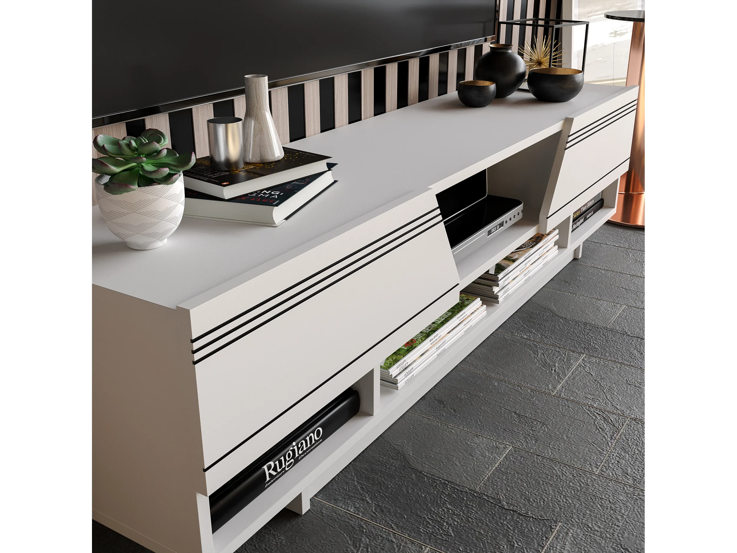 Meuble TV Kase de 120 cm - Armoires abattants (Blanc et Cordoba)