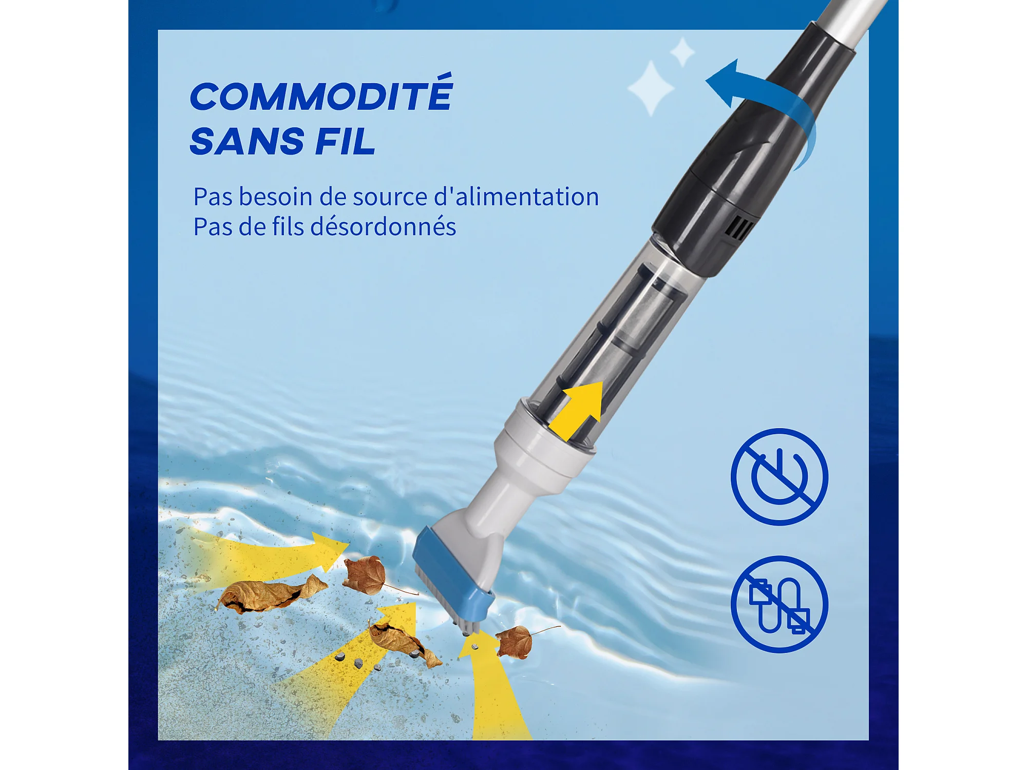 Aspirateur balai électrique sans fil piscine spa - manche télescopique 106-162 cm - brosse, sac filtrant - ABS alu. - blanc bleu