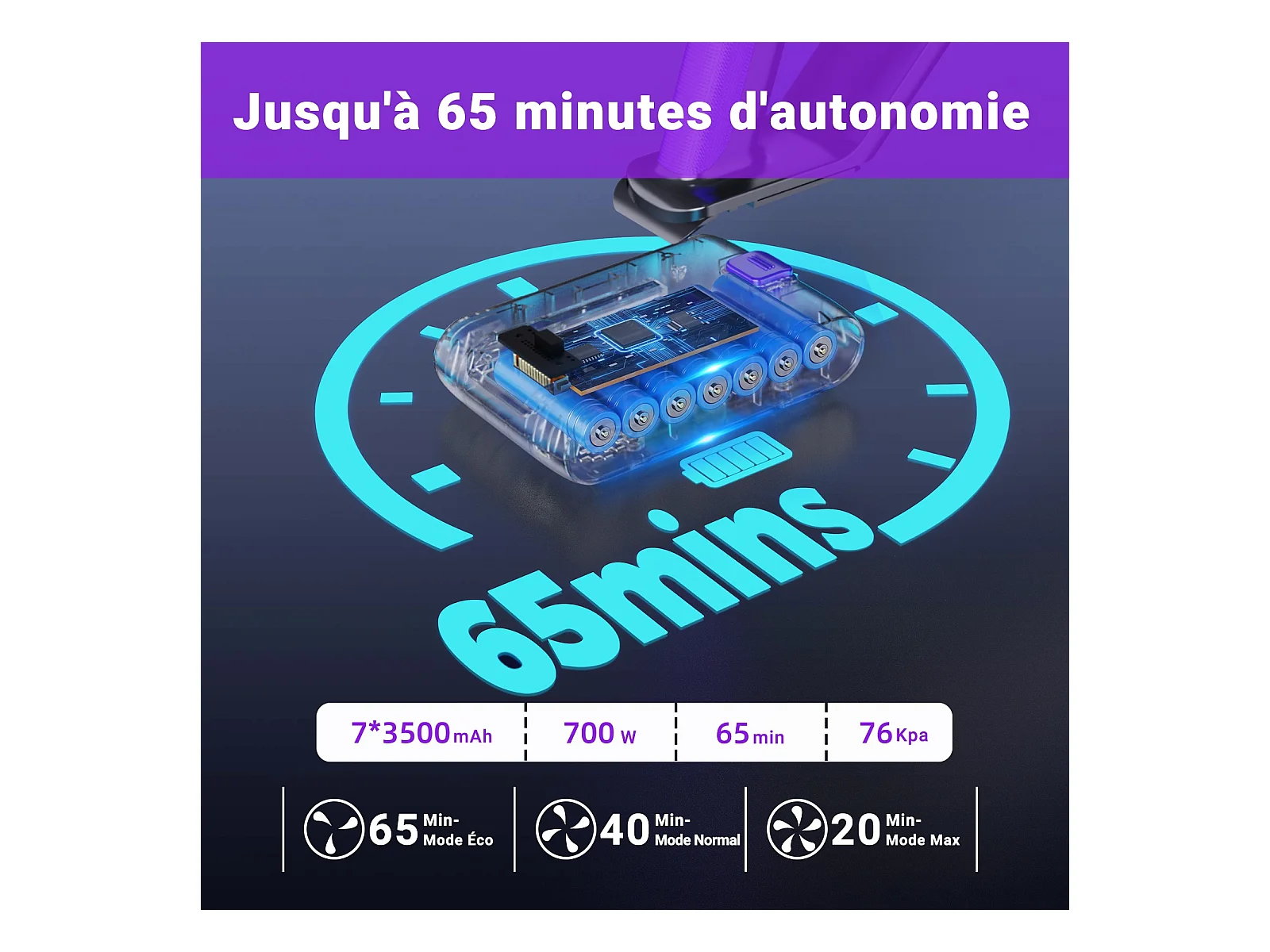 Hiazurm Aspirateur Sans Fil - 65000Pa Aspirateur - 3 Niveaux de Puissance d'Aspiration - Écran LED - 20-70 Min d'Autonomie - 1,8L - 550W - Violet