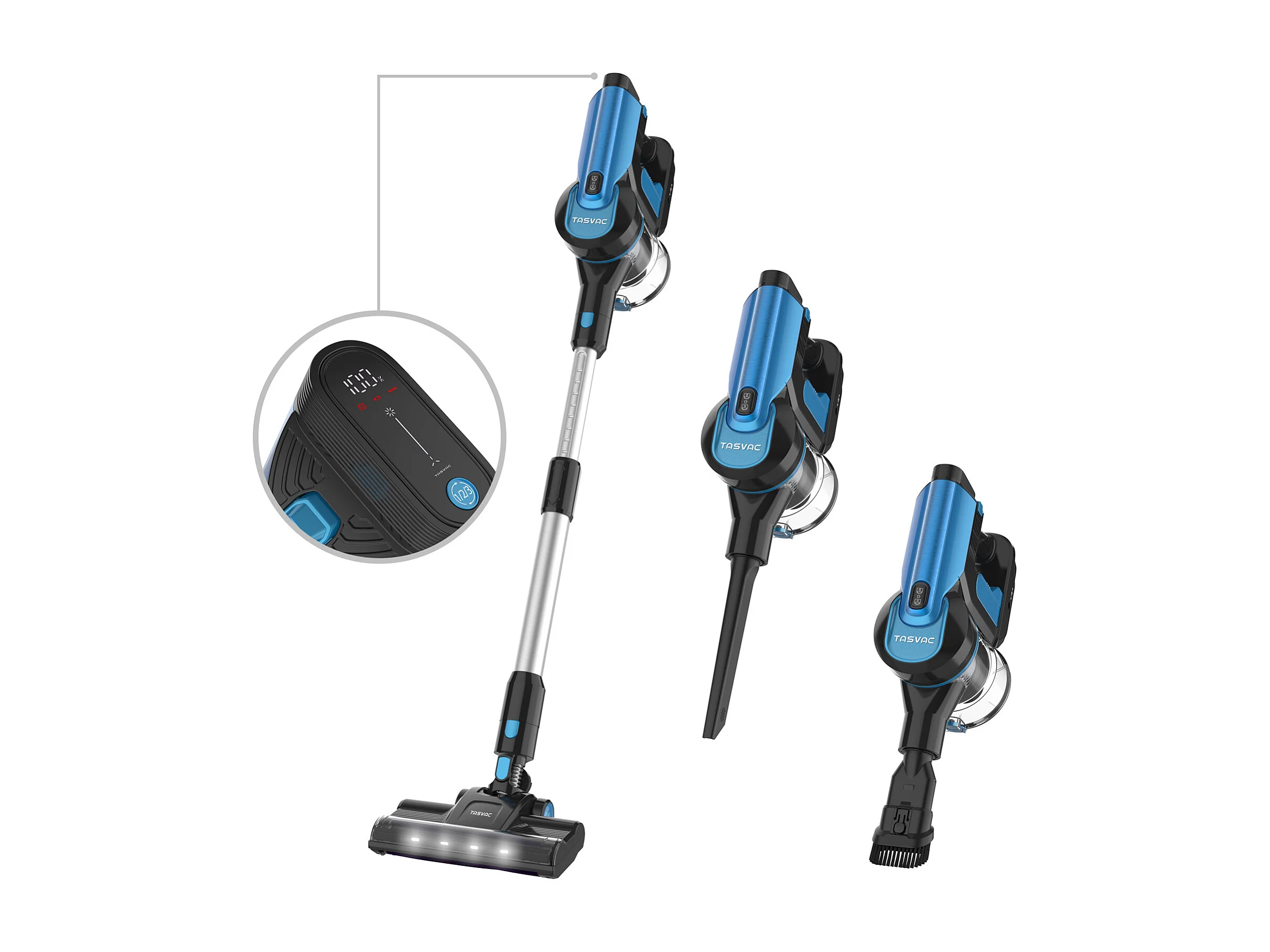 Aspirateur balai sans fil 2-en-1, moteur 300W, filtration HEPA, batterie 4000mAh, affichage LED, bleu (30x25x115 cm)
