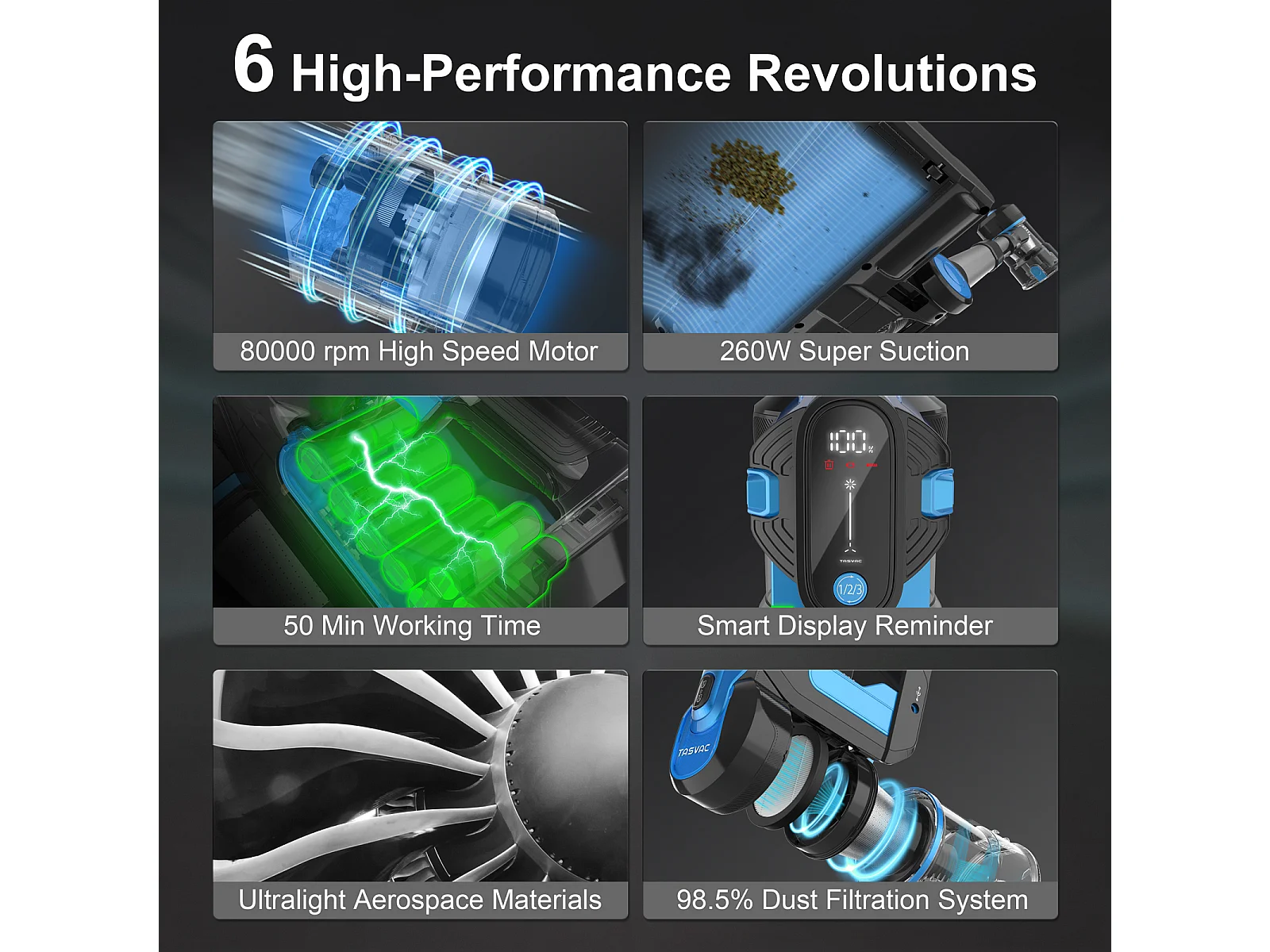Aspirateur balai sans fil avec affichage LED, moteur 260W, filtration HEPA, 23kPa de puissance d'aspiration, batterie amovible (43.5x32.5x19.5 cm)