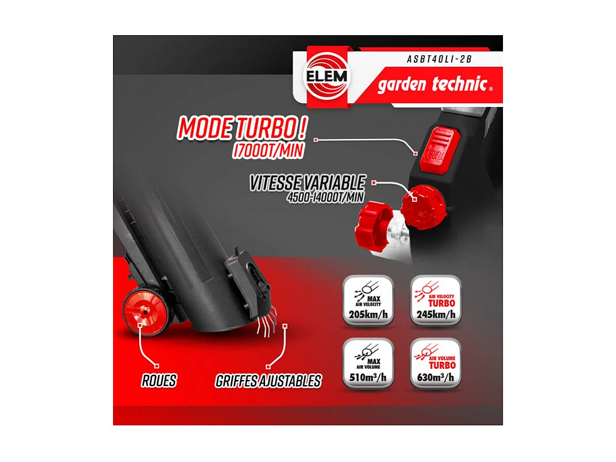 Aspirateur, Souffleur, Broyeur rechargeable 2x20V avec batteries et chargeur - Elem Garden Technic