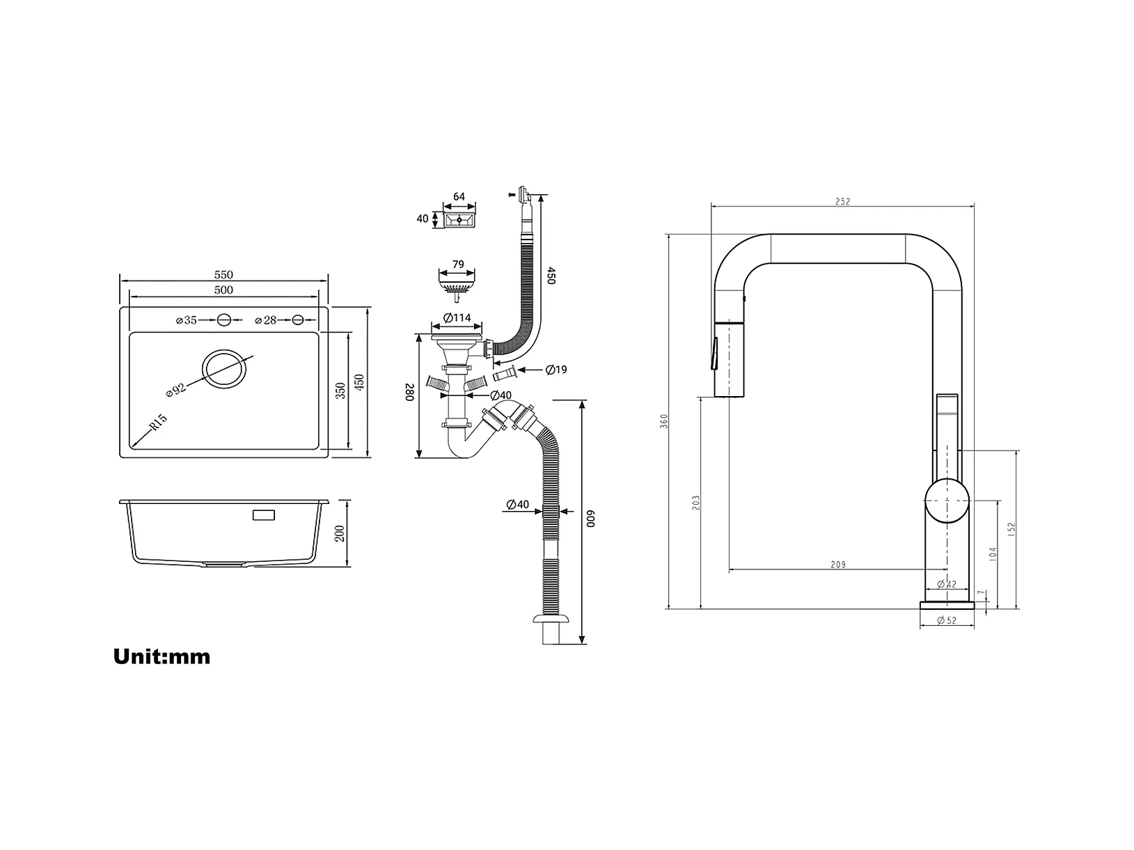 AuraLum Max 1 Bac Évier Cuisine en Granit,55*45*20cm,Kit de Vidage,Noir+Robinet de Cuisine avec Douchette Extractible Rotatif 360 °2 Fonct,EU Modèle