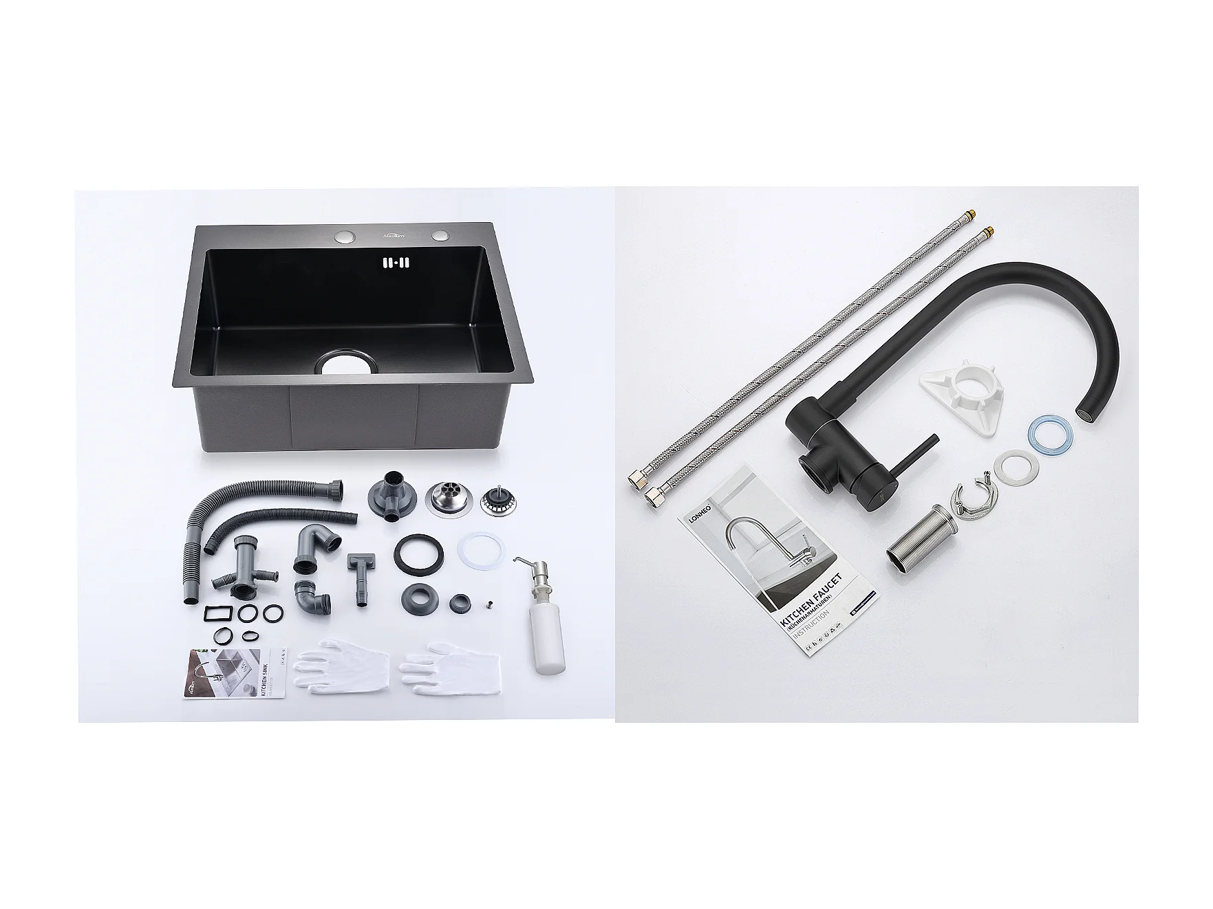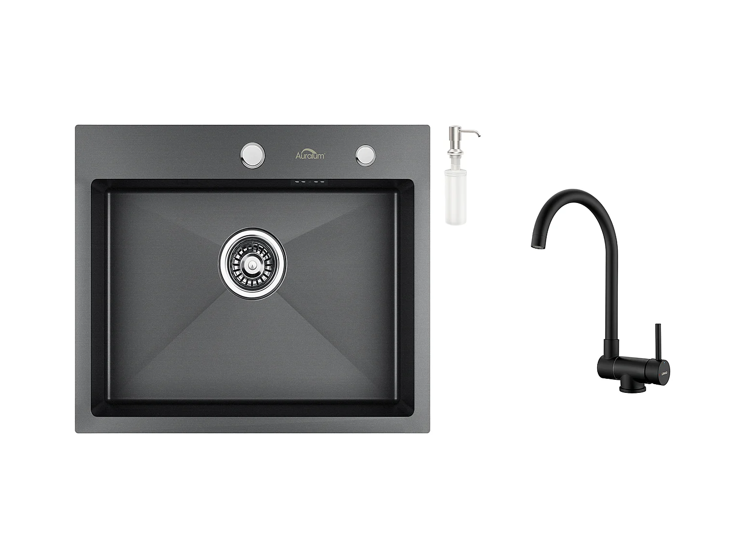 AuraLum Max Évier Cuisine 1 Bac 55*45CM Noir+Mitigeur Cuisine Rabattable Pivotant à 360°, avec Poignée Pliable Contre Fenêtre,Acier Inox 304,EU Modèle