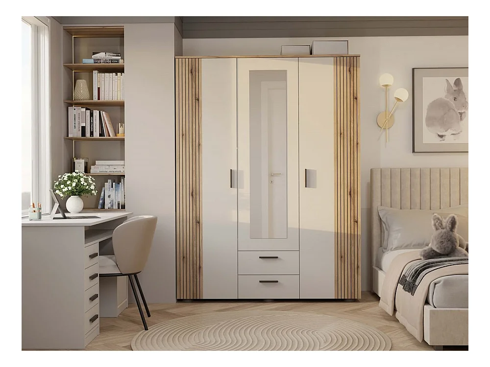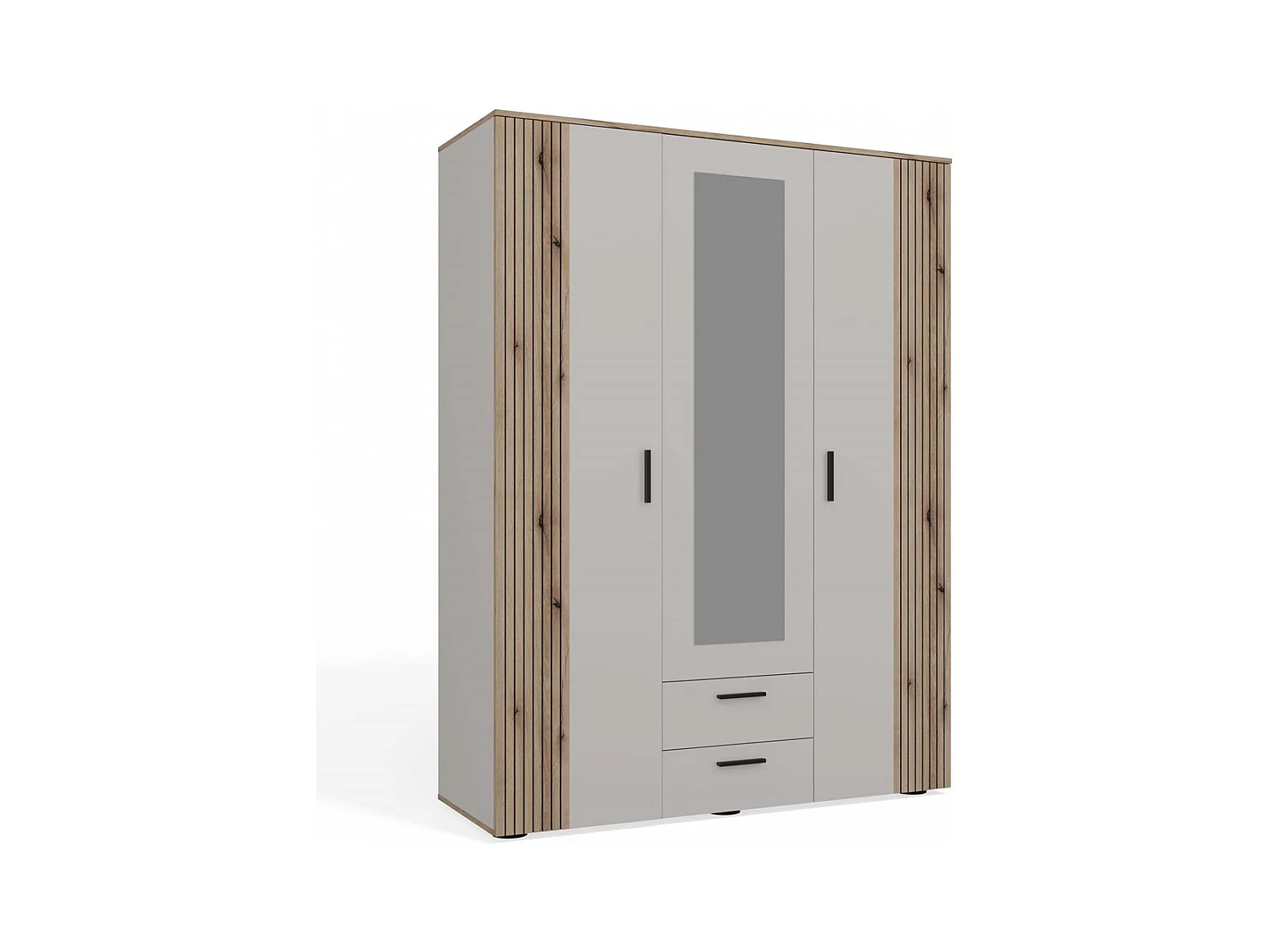 AVA - Armoire 150 cm avec miroir, 2 tiroirs et façade striée en chêne & beige cachemire