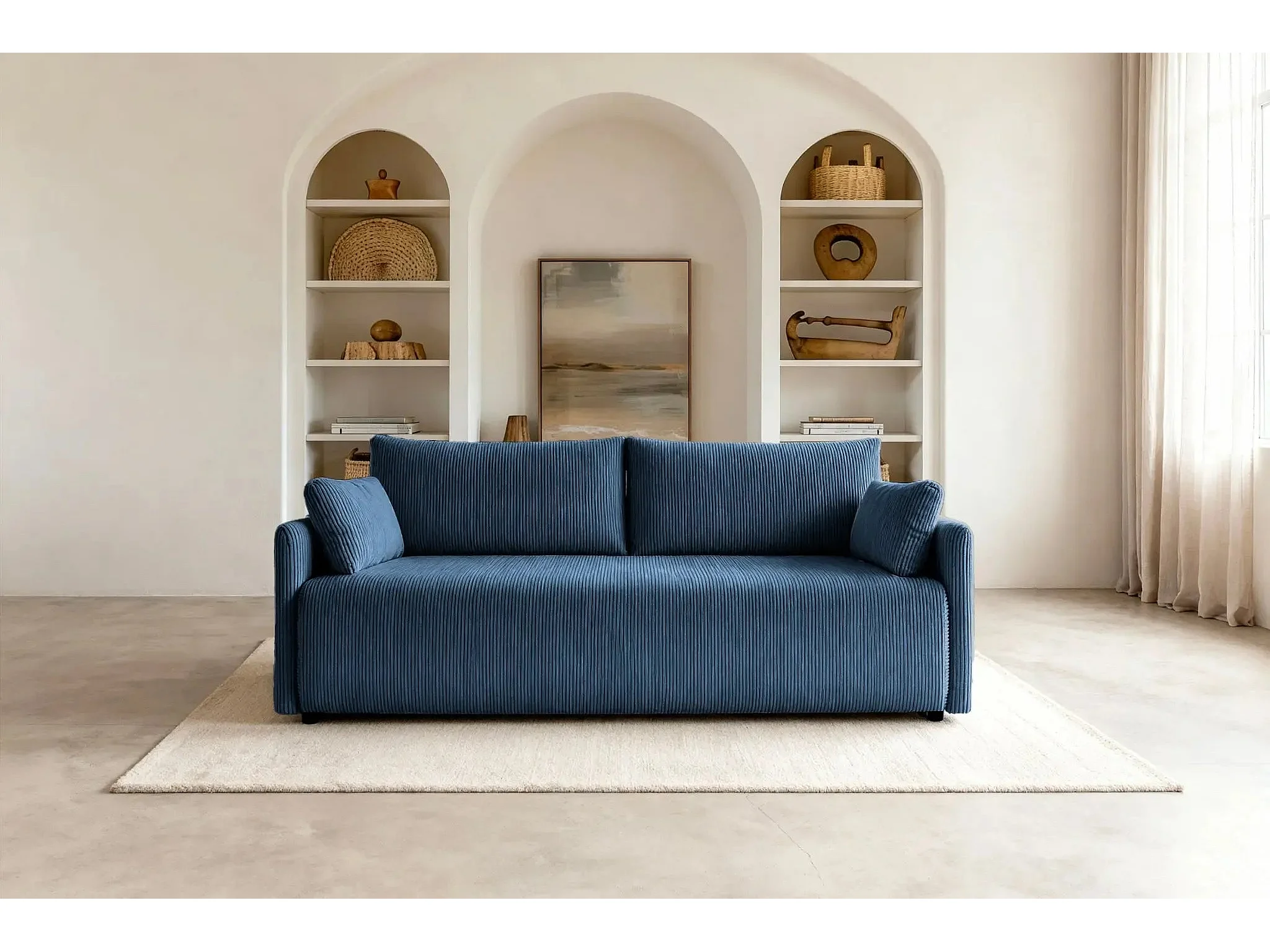 AXELLE - Canapé droit convertible velours côtelé 2 places - Bleu
