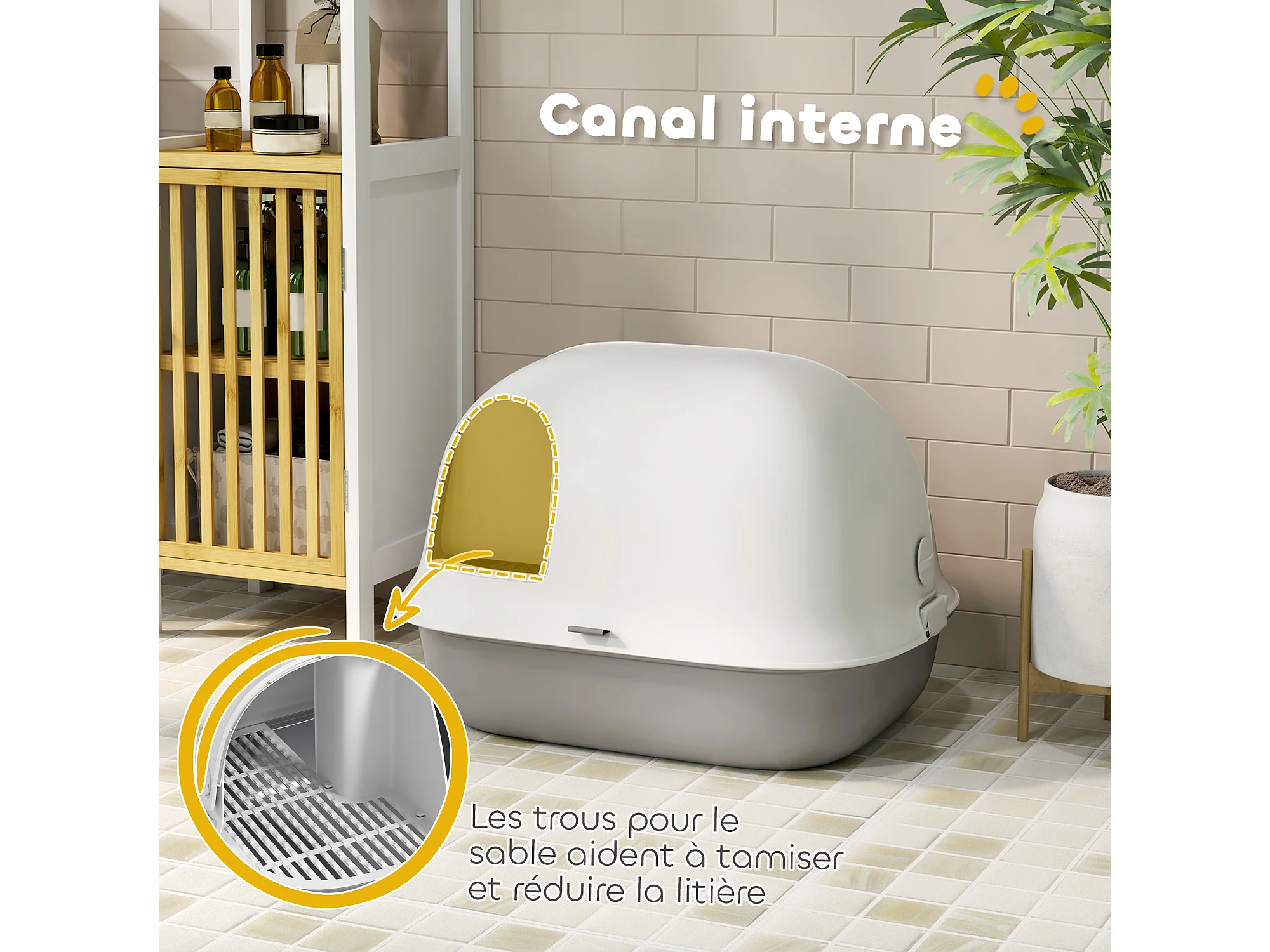 Bac à litière chat semi-fermé - couvercle supérieur verrouillable ouvrable, pelle - 58 x 46 x 39 cm - PP gris blanc