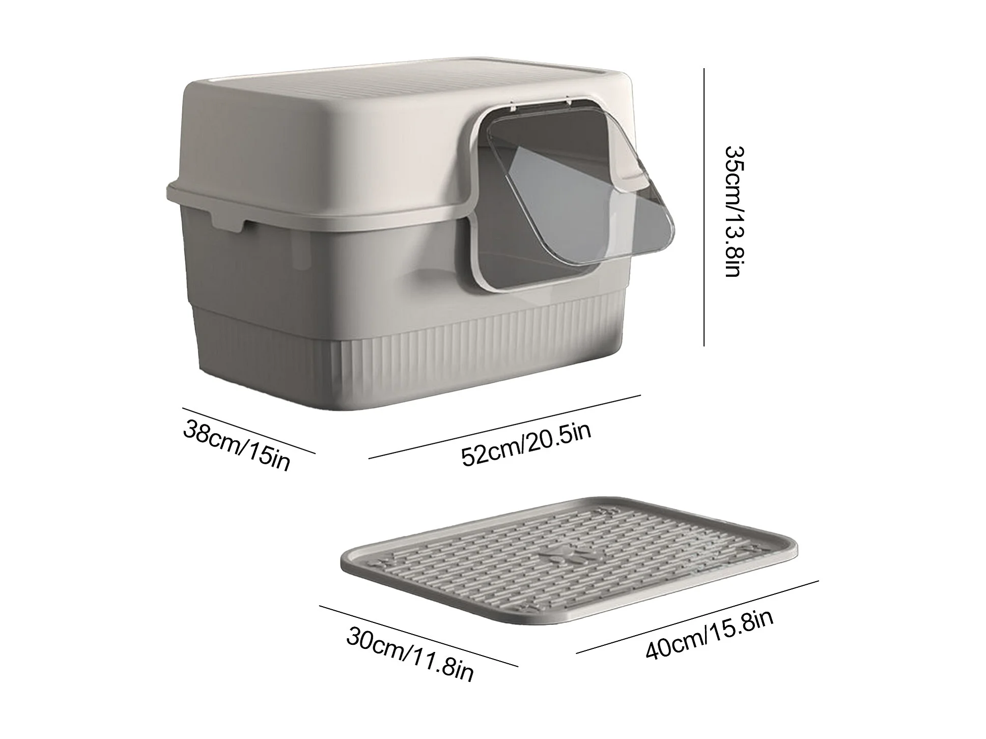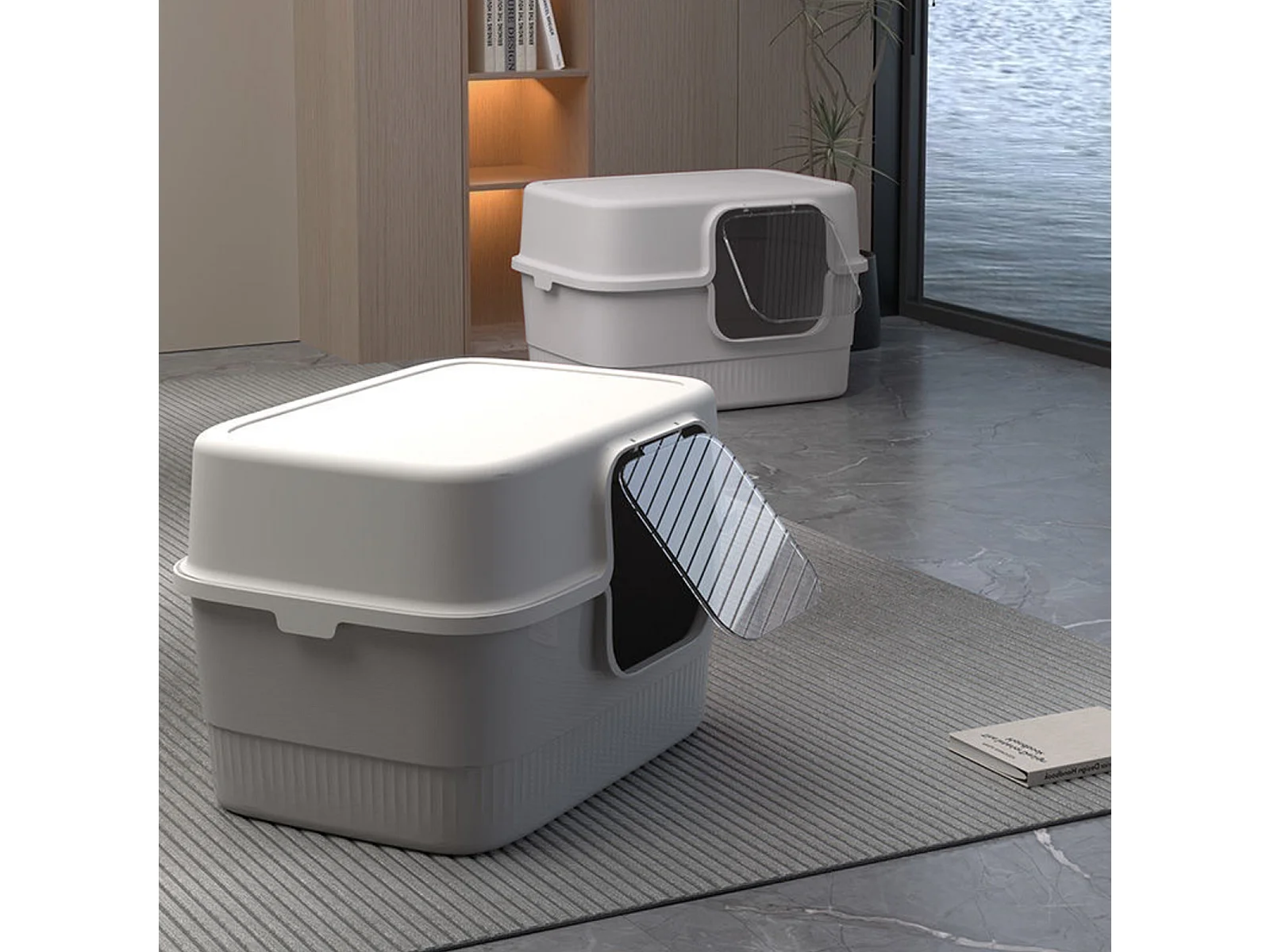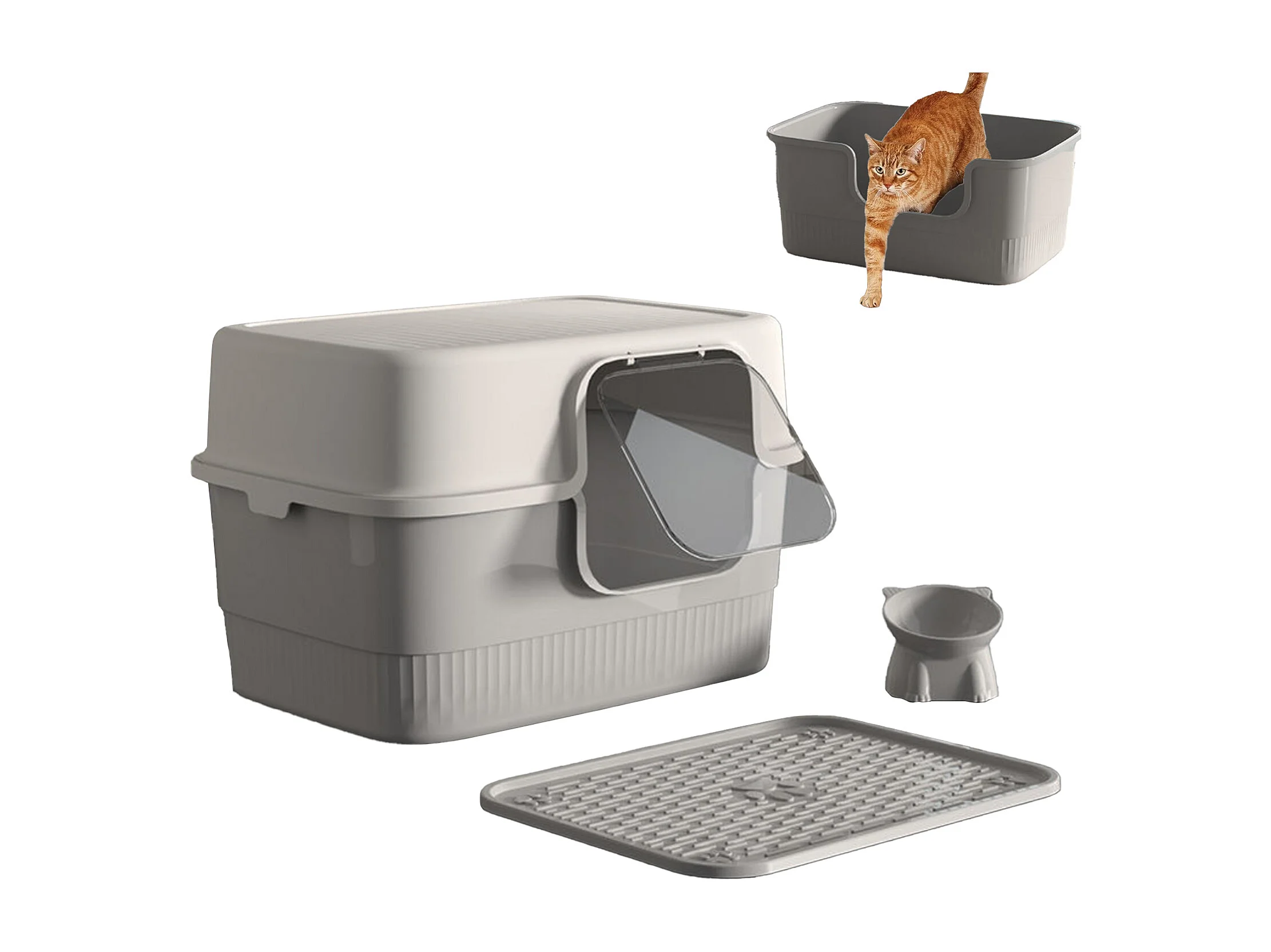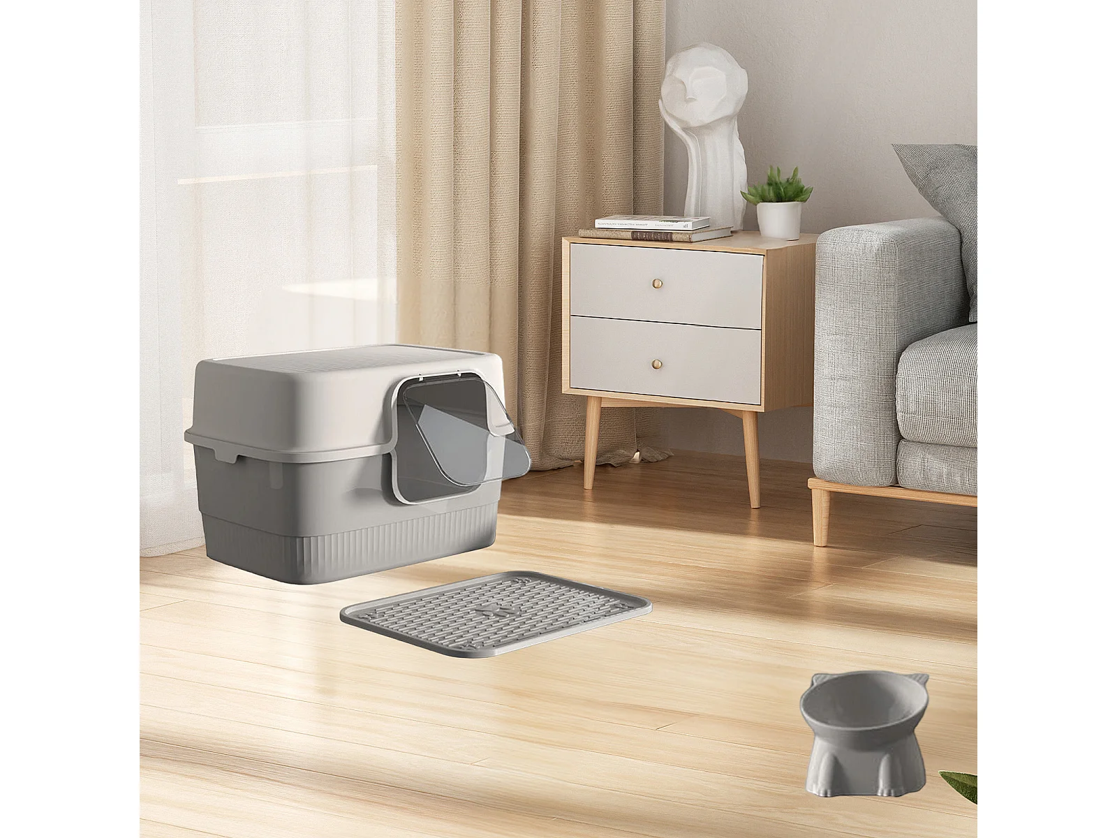Bac à litière fermé gris 52 x 38 x 35 cm avec pelle + tapis + gamelle pour animaux