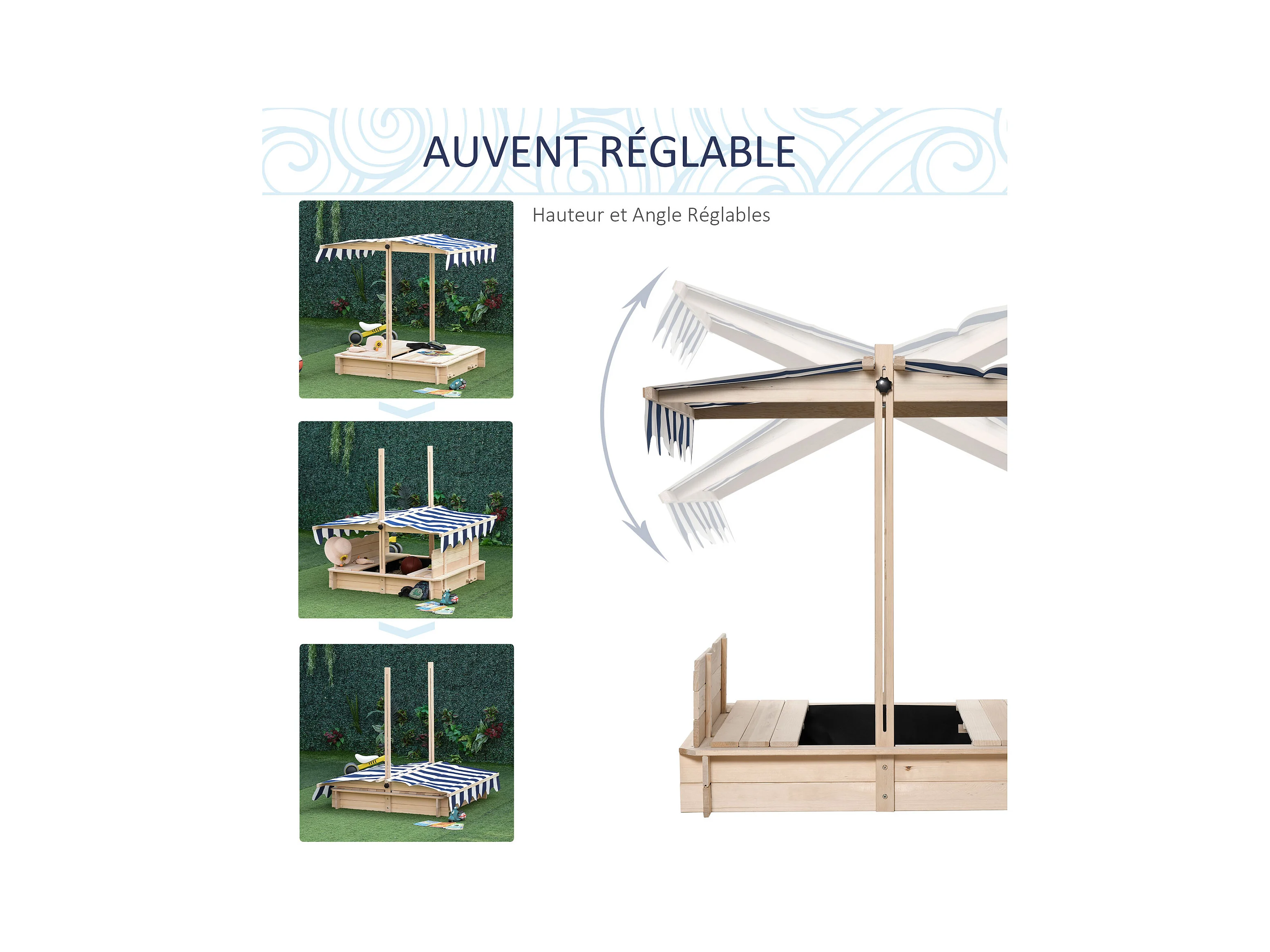 Bac à sable carré en bois pour enfant dim. 106L x 106l cm avec bancs et couvercle - auvent réglable