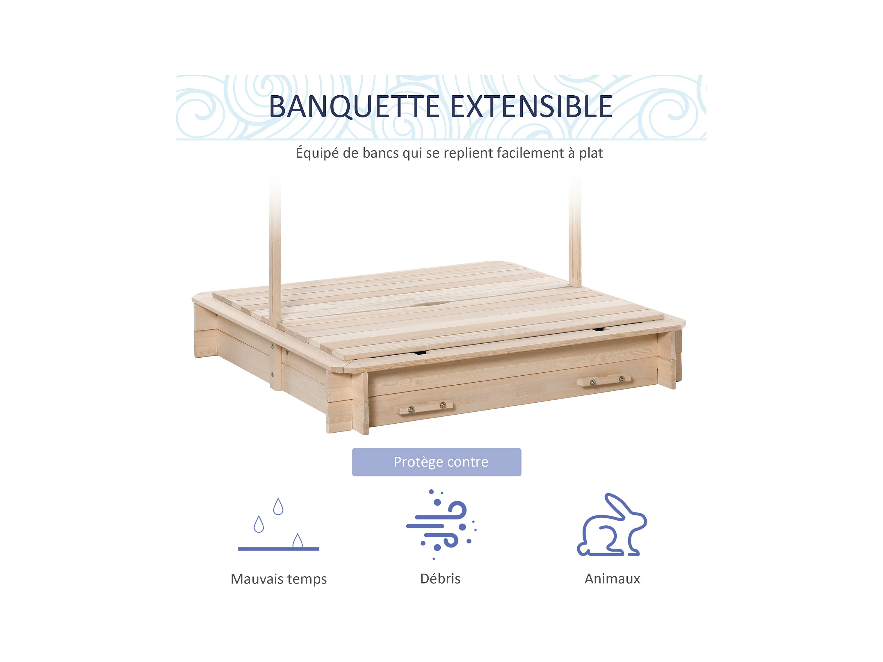 Bac à sable bois carré dim. 1,18L x 1,18l x 1,18H m - hauteur, inclinaison toit réglables, refermable - 2 bacs - bois sapin autoclave