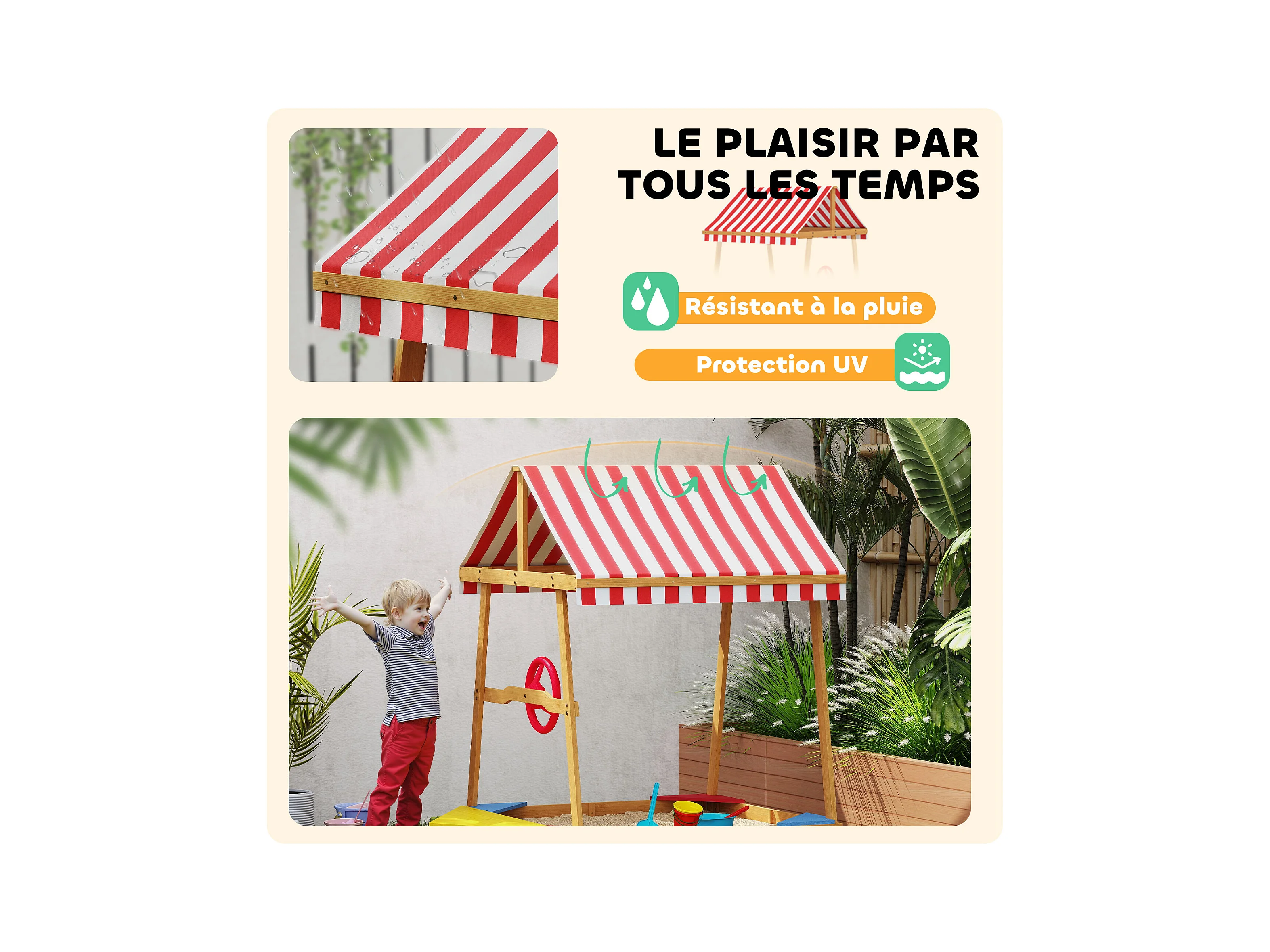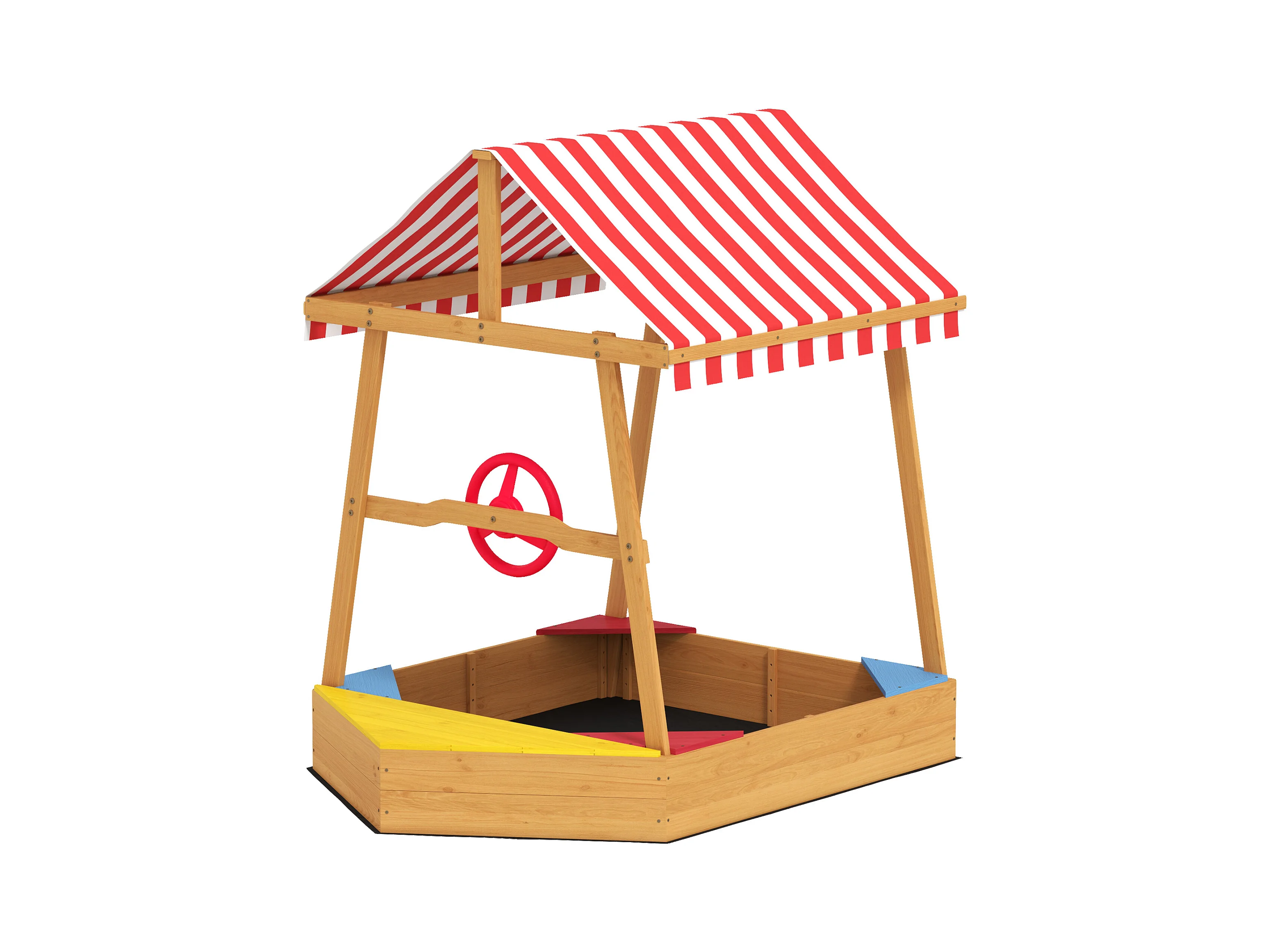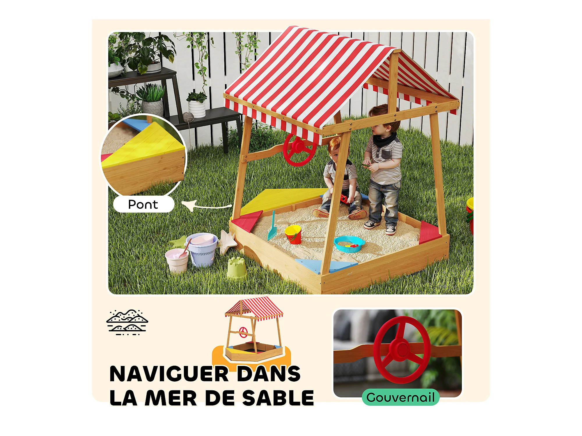 Bac à sable en bois design bateau enfant - sièges, store double pente, gouvernail - bois pré-huilé