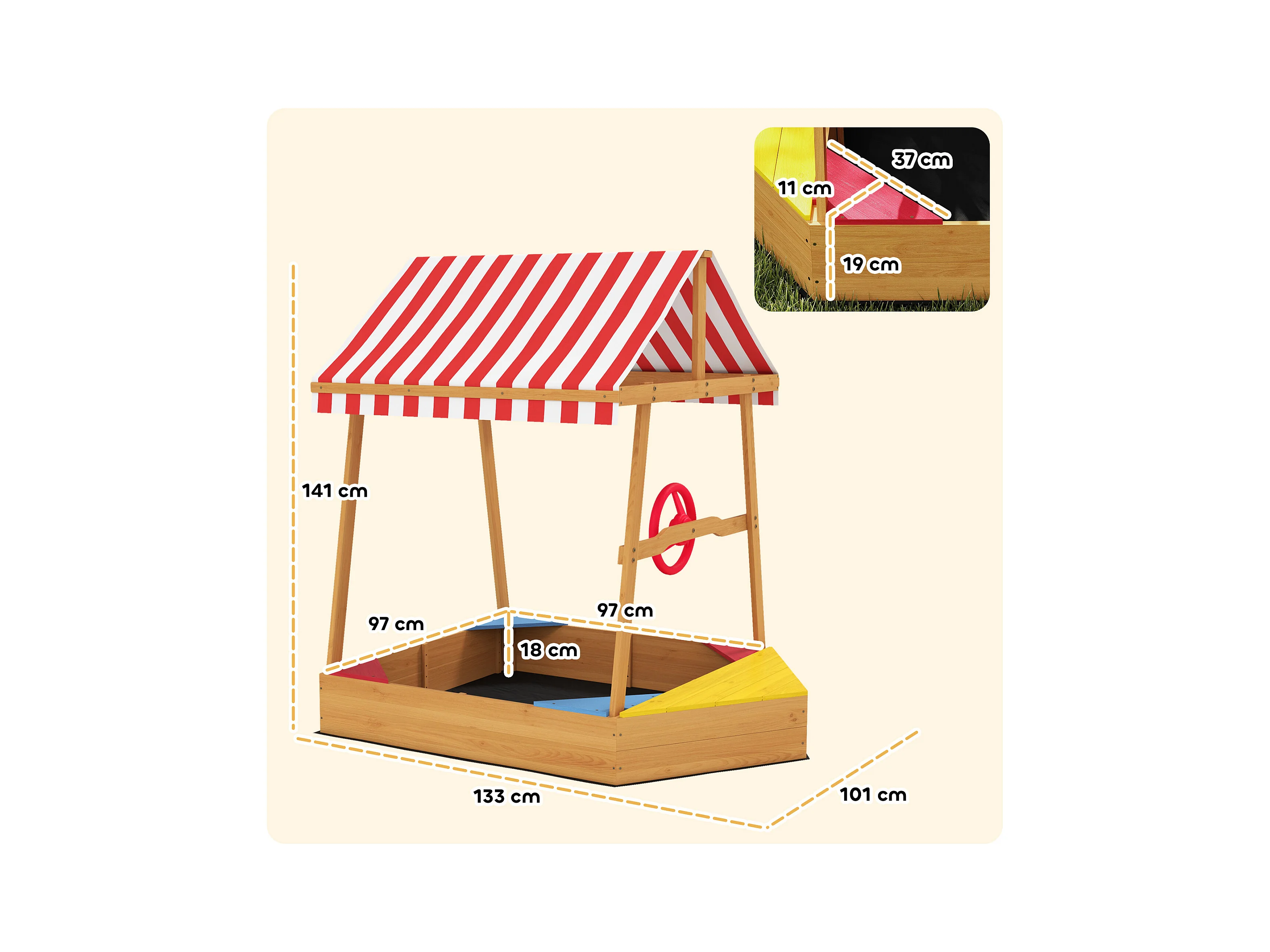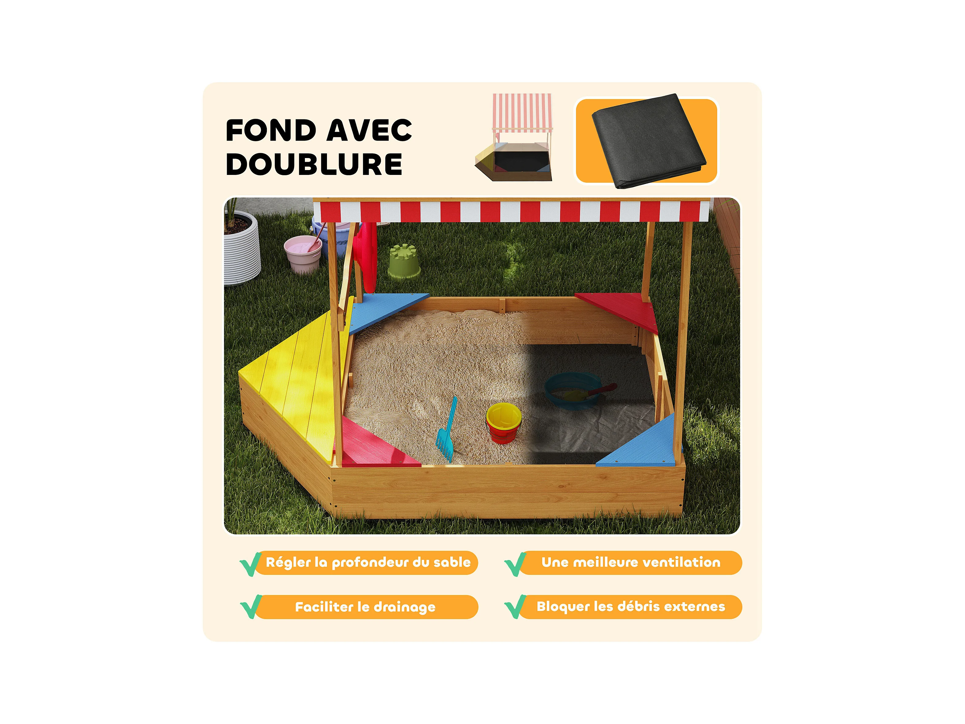 Bac à sable en bois avec toit refermable et doublure dim. 120 x 120 x 126,5 cm bois sapin