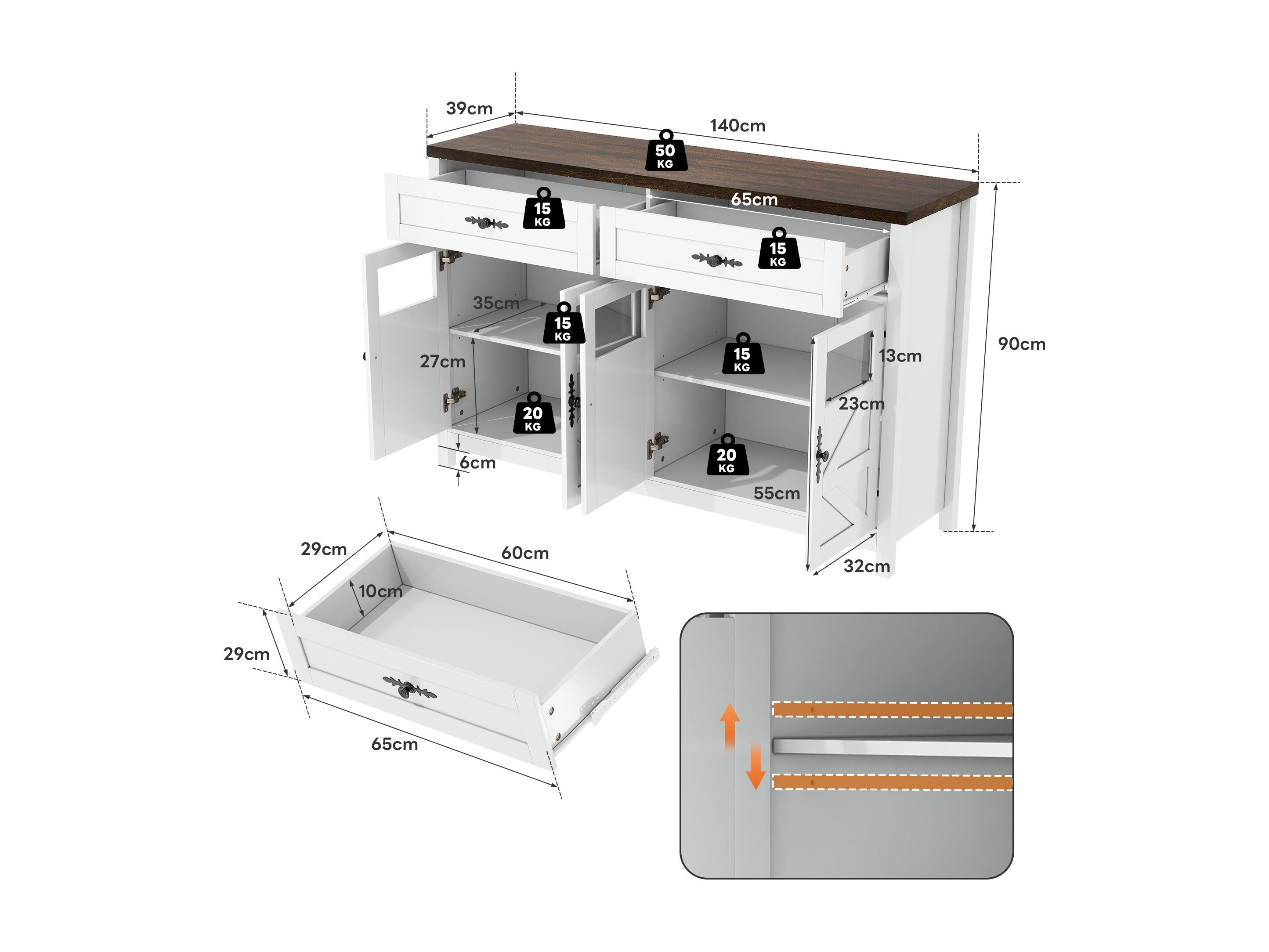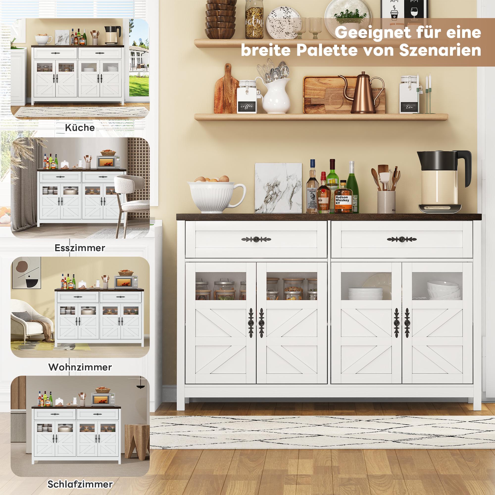 Bahut, Buffet avec 2 Tiroirs et 4 Portes, Buffet Rangement, Armoire de Cuisine, Style Campagne, Bahut de Salon, Blanc Rustique