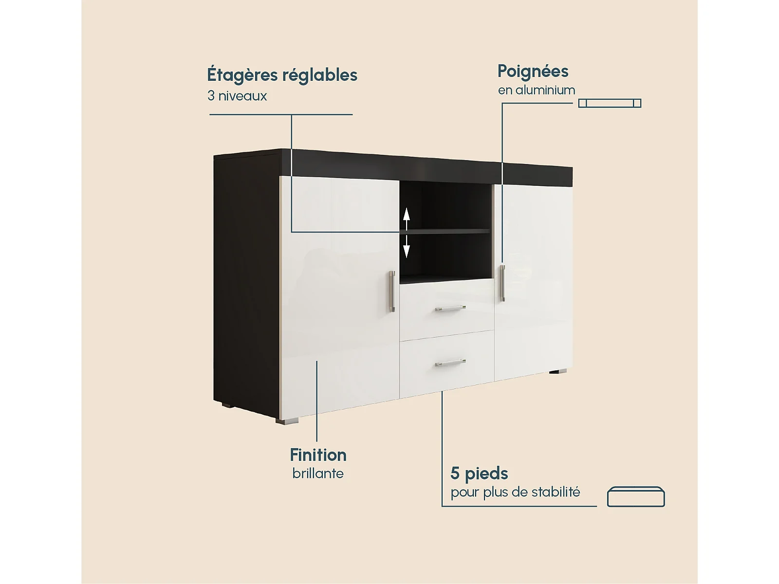 Bahut Buffet pour Salon Salle à manger en Noir et Blanc 140x40x80cm Roque