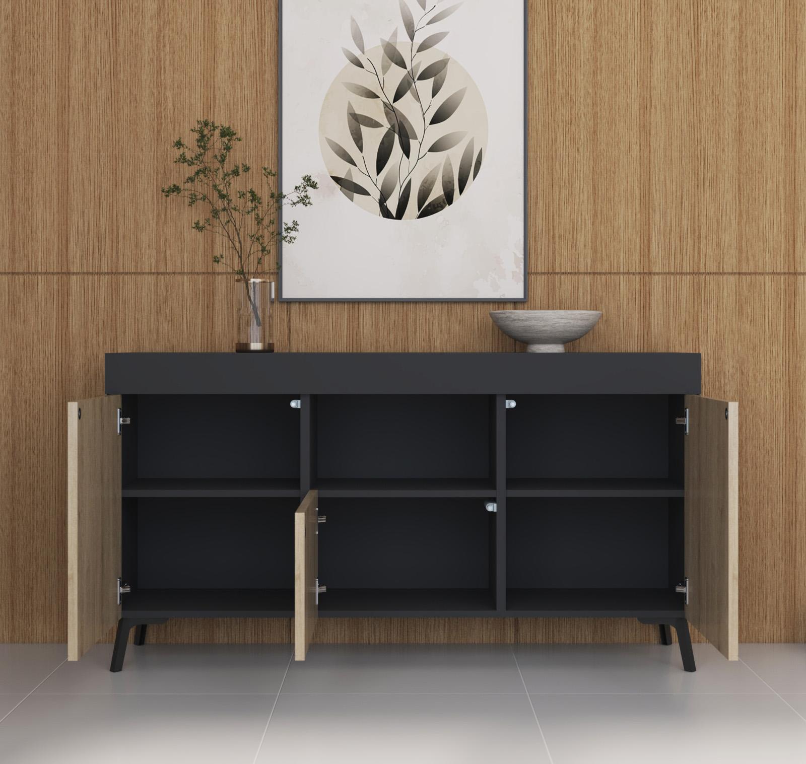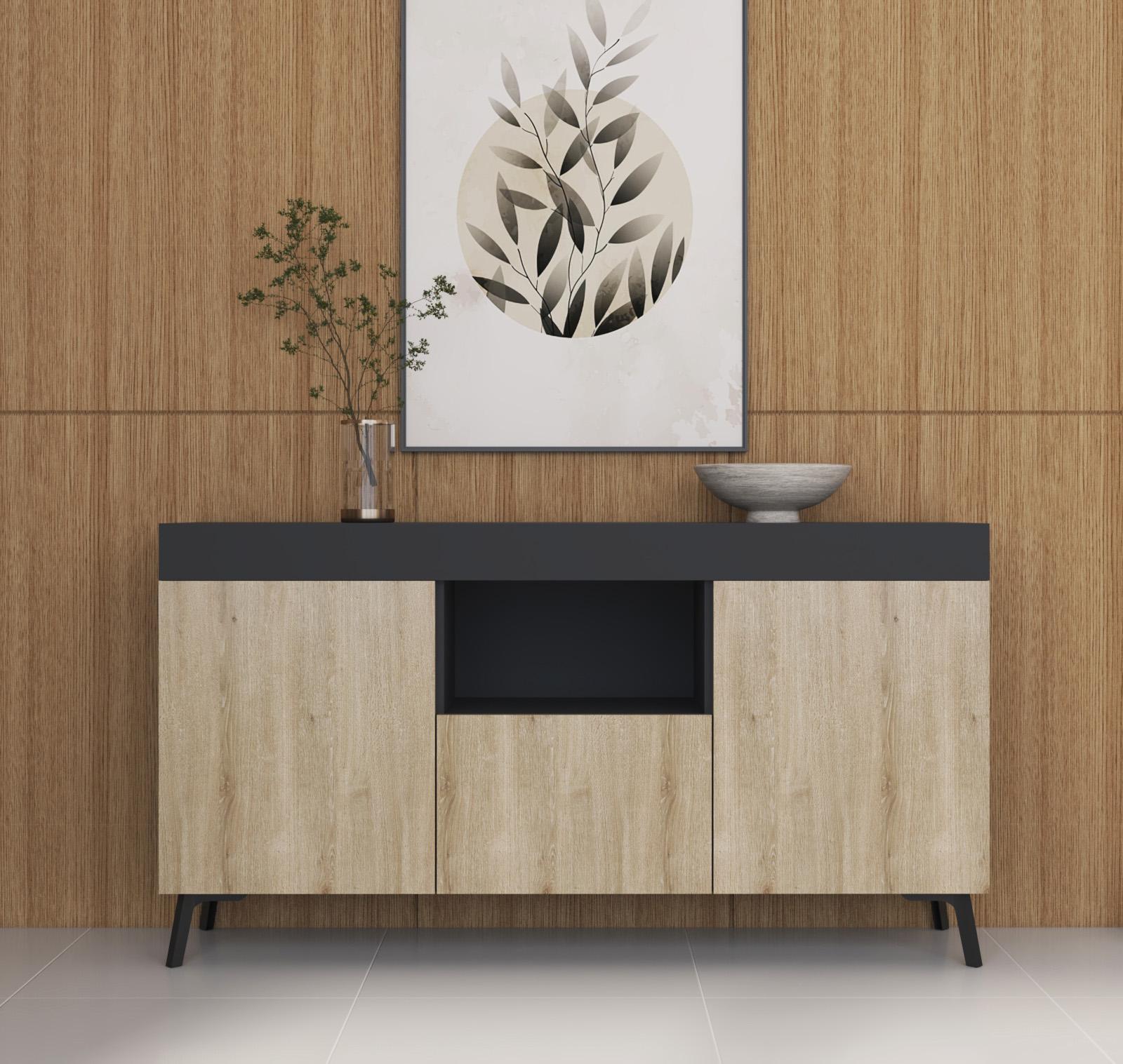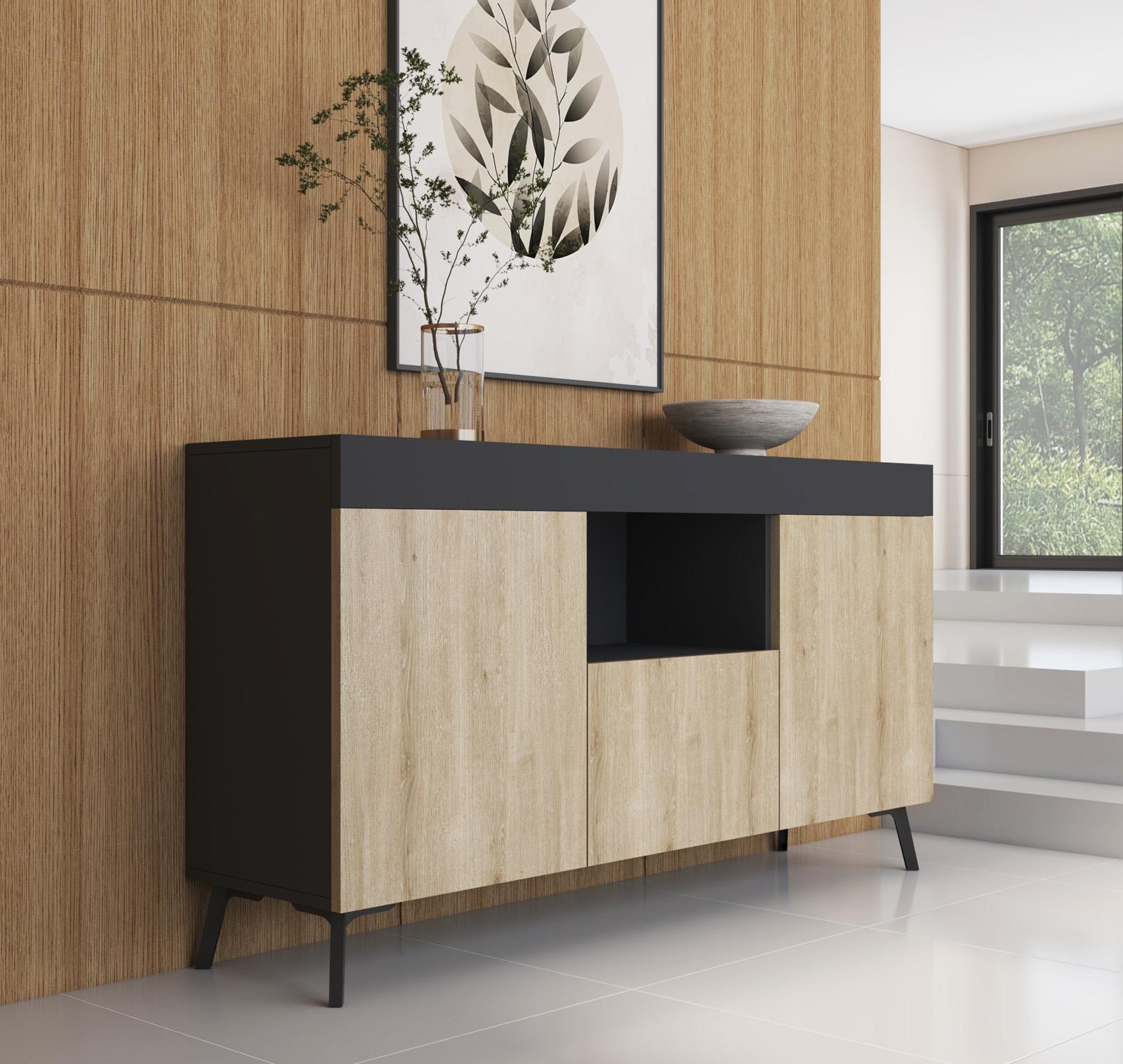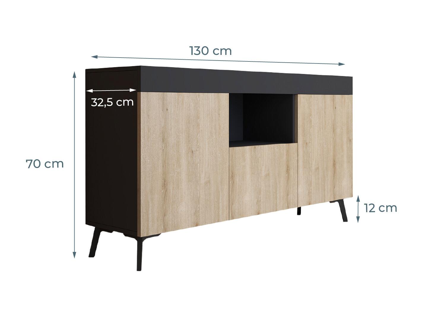 Bahut Buffet pour Salon Salle à manger en Noir et Sonoma 130x32,5x70cm Kai