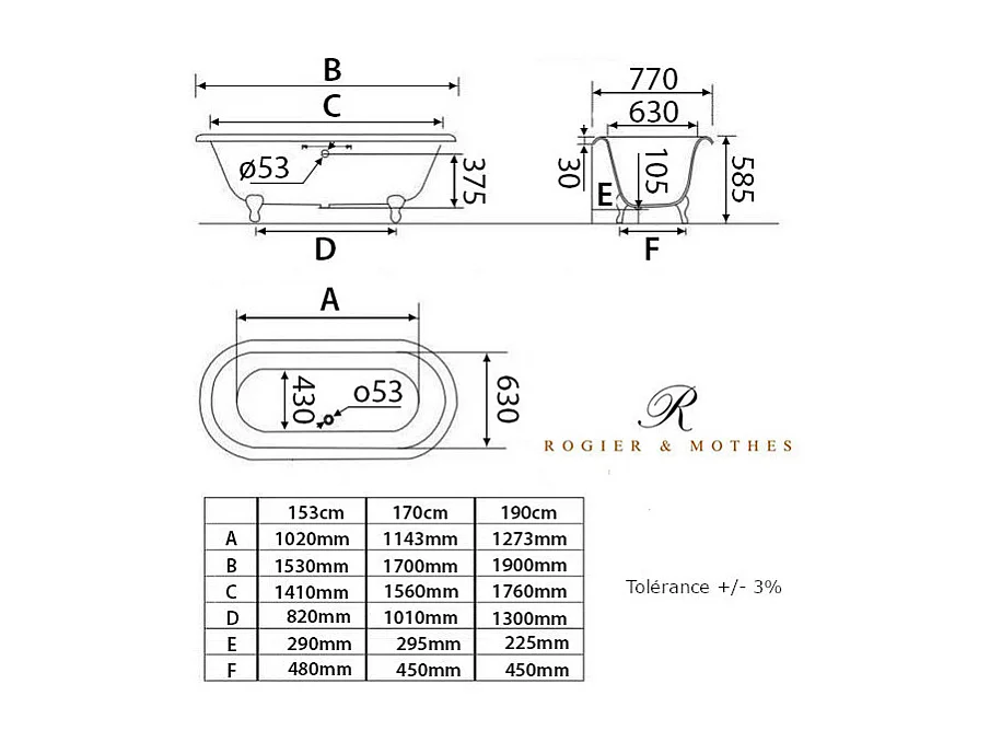 Baignoire sur pieds en fonte PLYMOUTH Noire 153 cm Pieds blancs