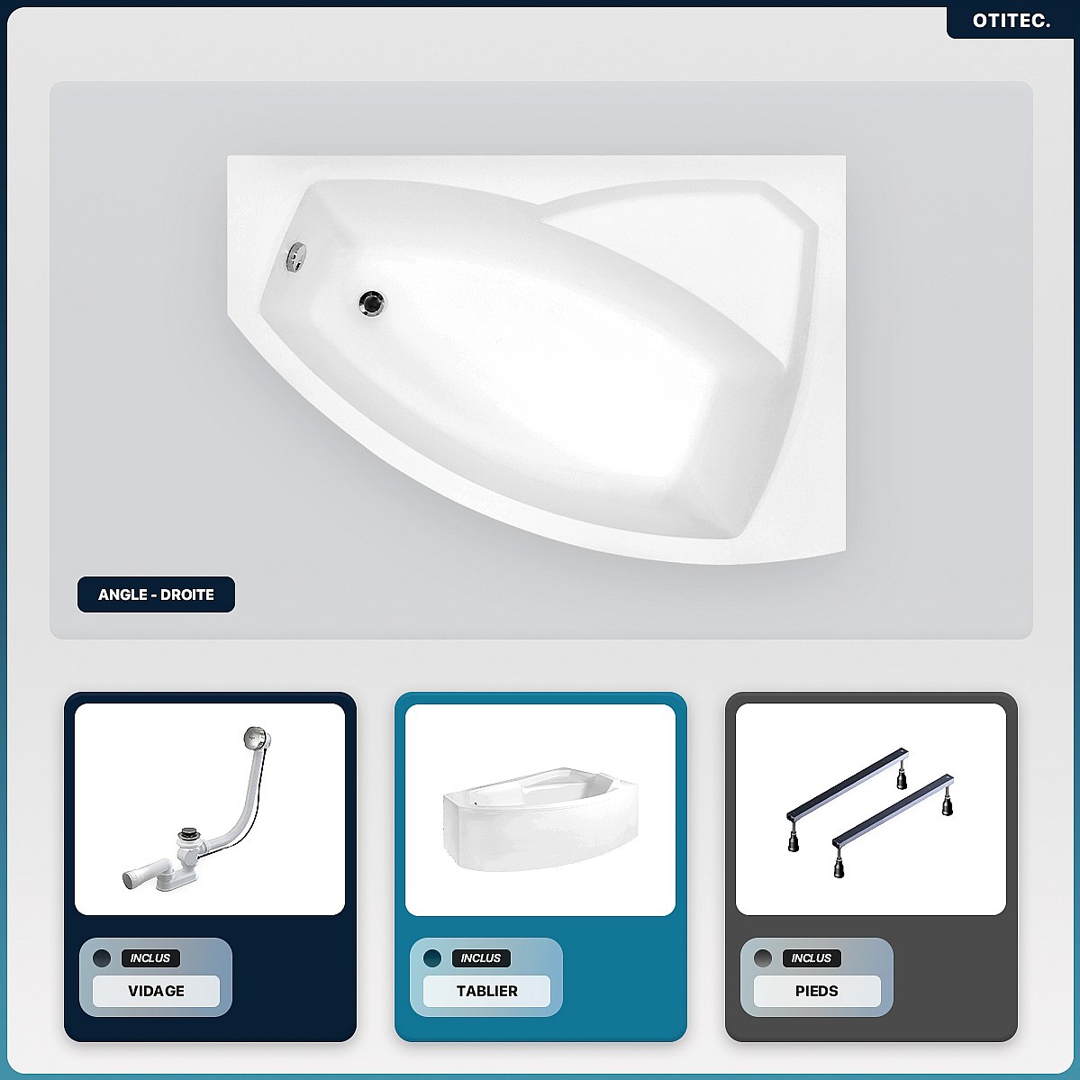 Baignoire asymétrique - 130 x 85 cm - Droite - avec Tablier - Pieds - Vidage Chrome - RIMA