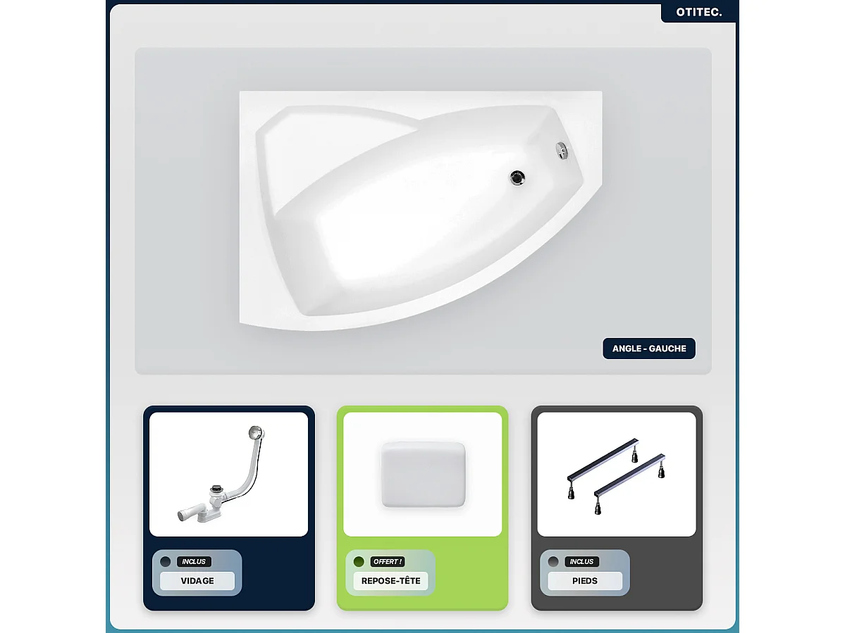 Baignoire asymétrique - 130 x 85 cm - Gauche - sans Habillage - avec Pieds - Repose-tête - Vidage Chrome - RIMA