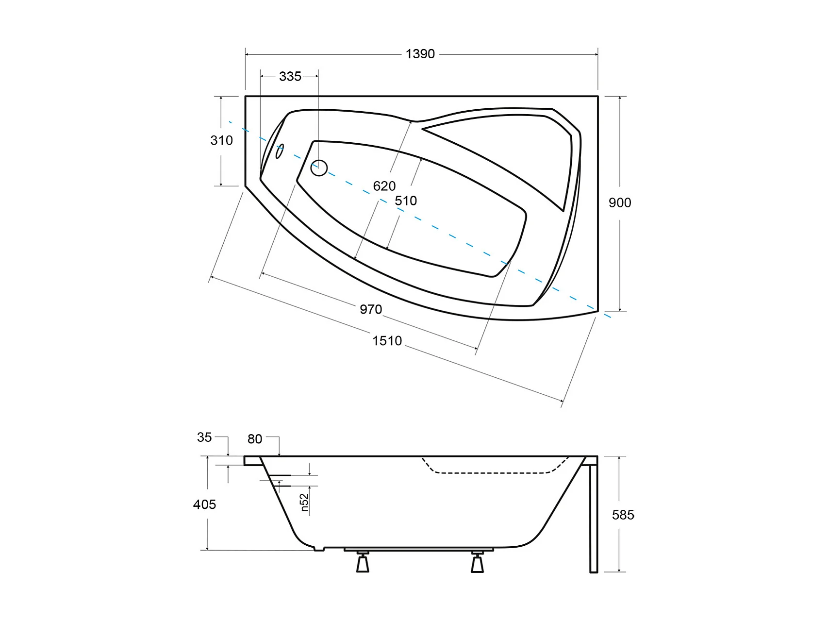 Baignoire asymétrique 140x90 Droite RIMA acrylique blanc, sans Habillage + Repose Tête + Pieds + Vidage à chromé