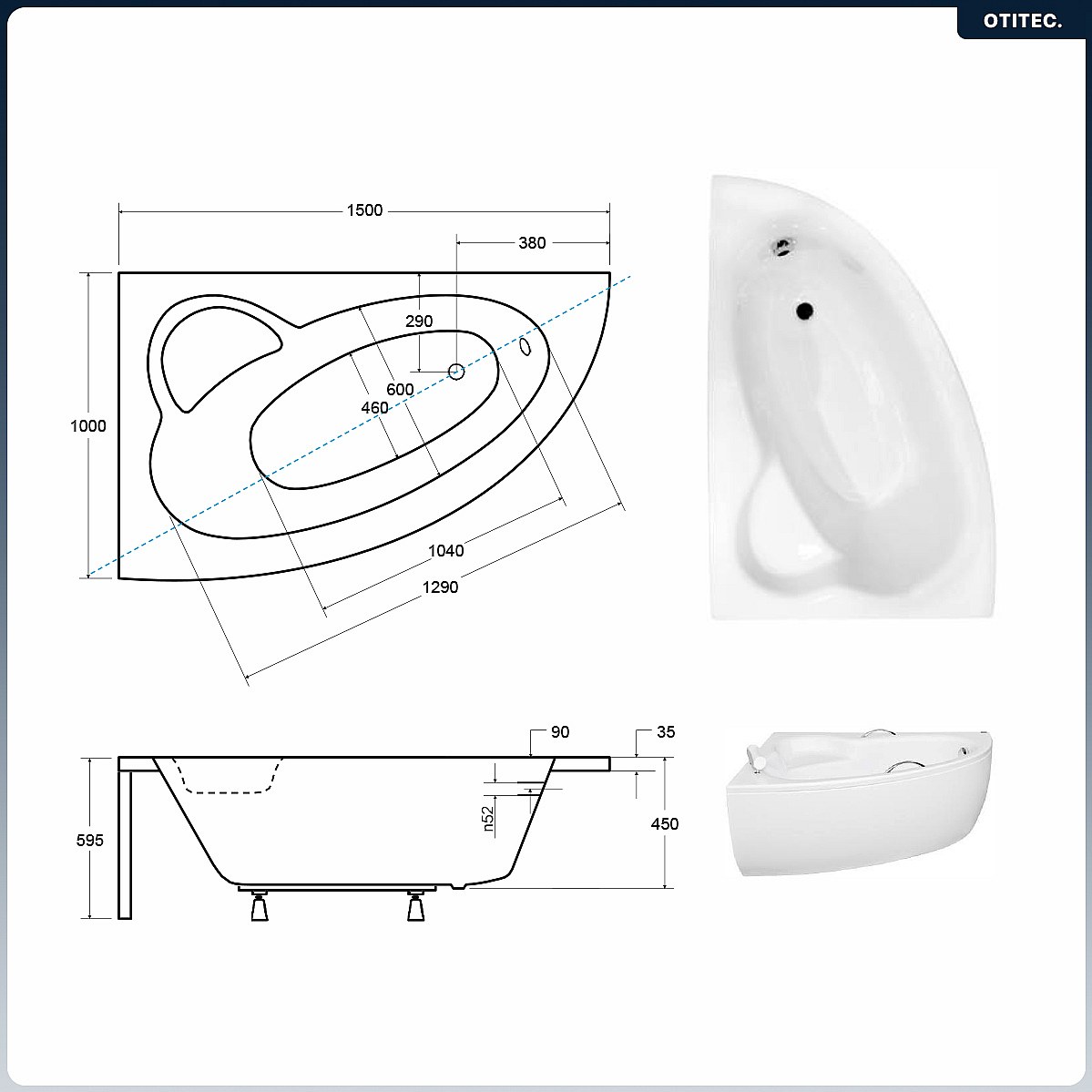 Baignoire asymétrique - 150 x 100 cm - Gauche - sans Habillage - avec Pieds - Vidage Chrome - NATALIA