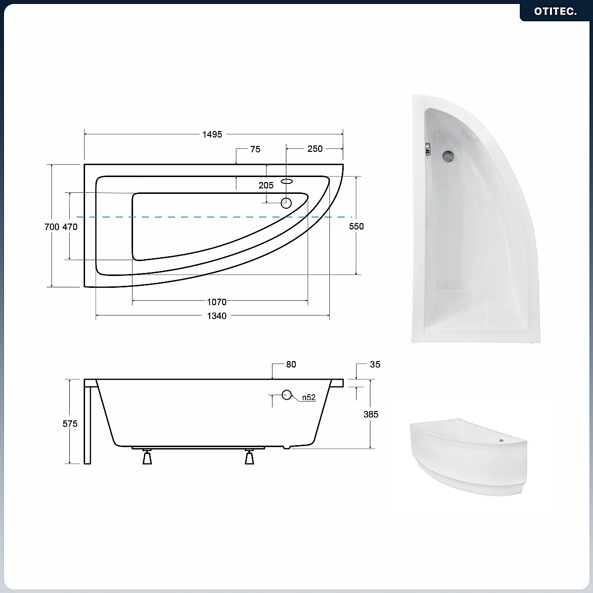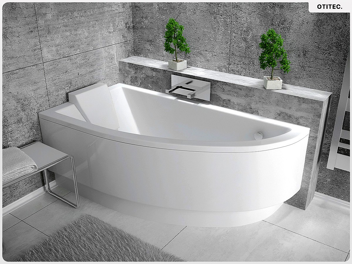 Baignoire asymétrique - 150 x 70 cm - Gauche - avec Tablier - Pieds - Vidage Chrome - PRAKTIKA