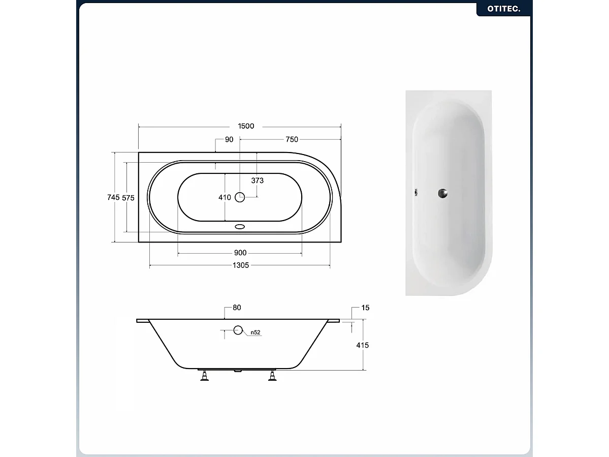 Baignoire asymétrique - 150 x 75 cm - Droite - sans Habillage - avec Pieds - Vidage Chrome - AVITA SLIM