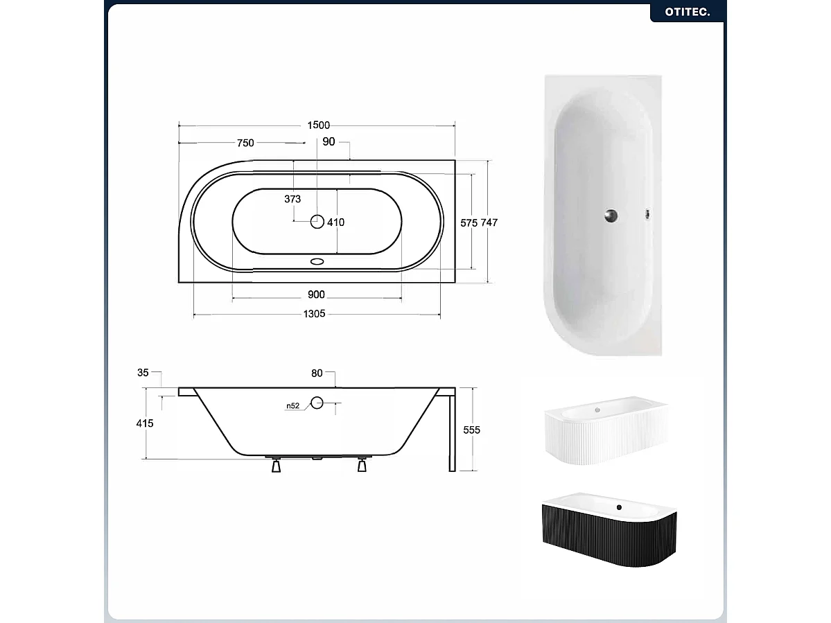 Baignoire asymétrique - 150 x 75 cm - Gauche - avec Tablier Rainuré - Siphon Chrome & Pieds - INCLUS - AVITA WHITE