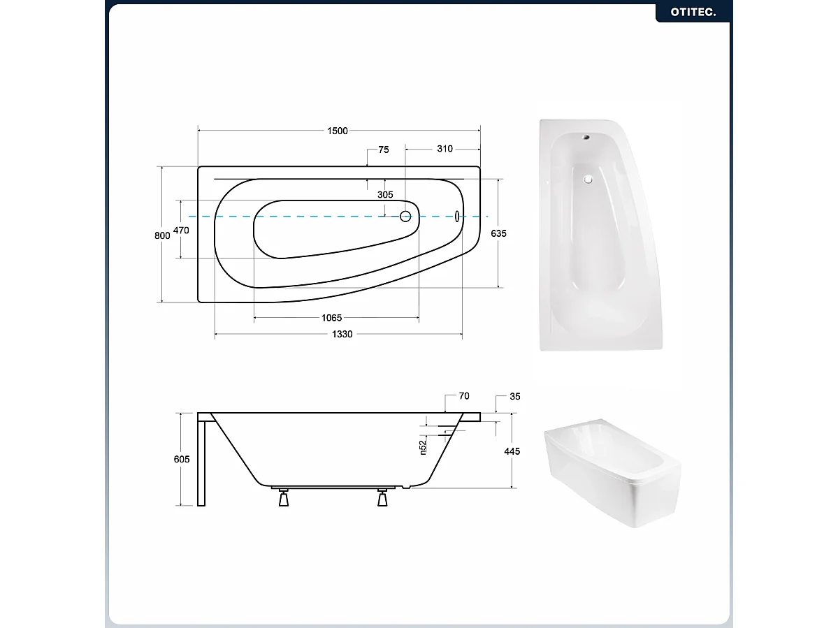 Baignoire asymétrique - 150 x 80 cm - Gauche - avec Habillage - Pieds - Vidage Chrome - LUNA