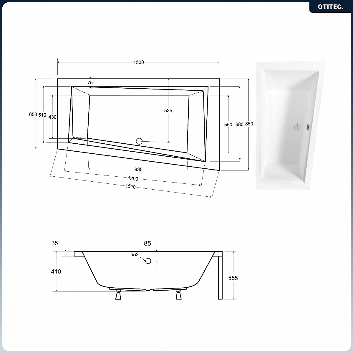 Baignoire asymétrique - 150 x 85 cm - Droite - avec Habillage - Pieds - Vidage Chrome - INTIMA
