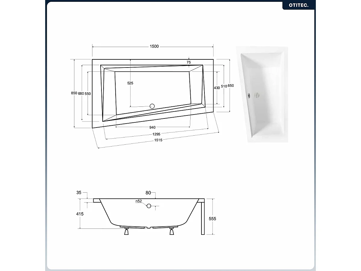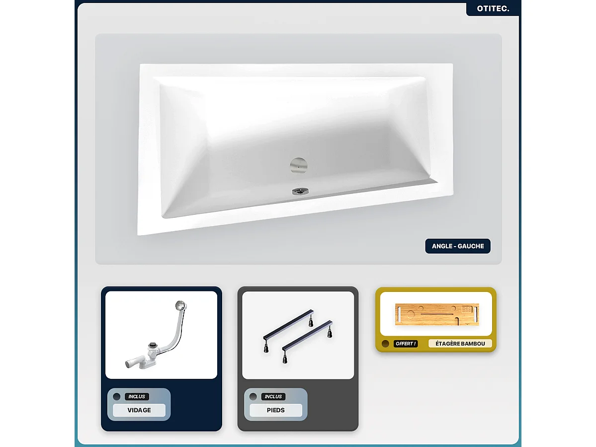 Baignoire asymétrique - 150 x 85 cm - Gauche - sans Habillage - avec Pieds - Étagère bambou - Vidage Chrome - INTIMA