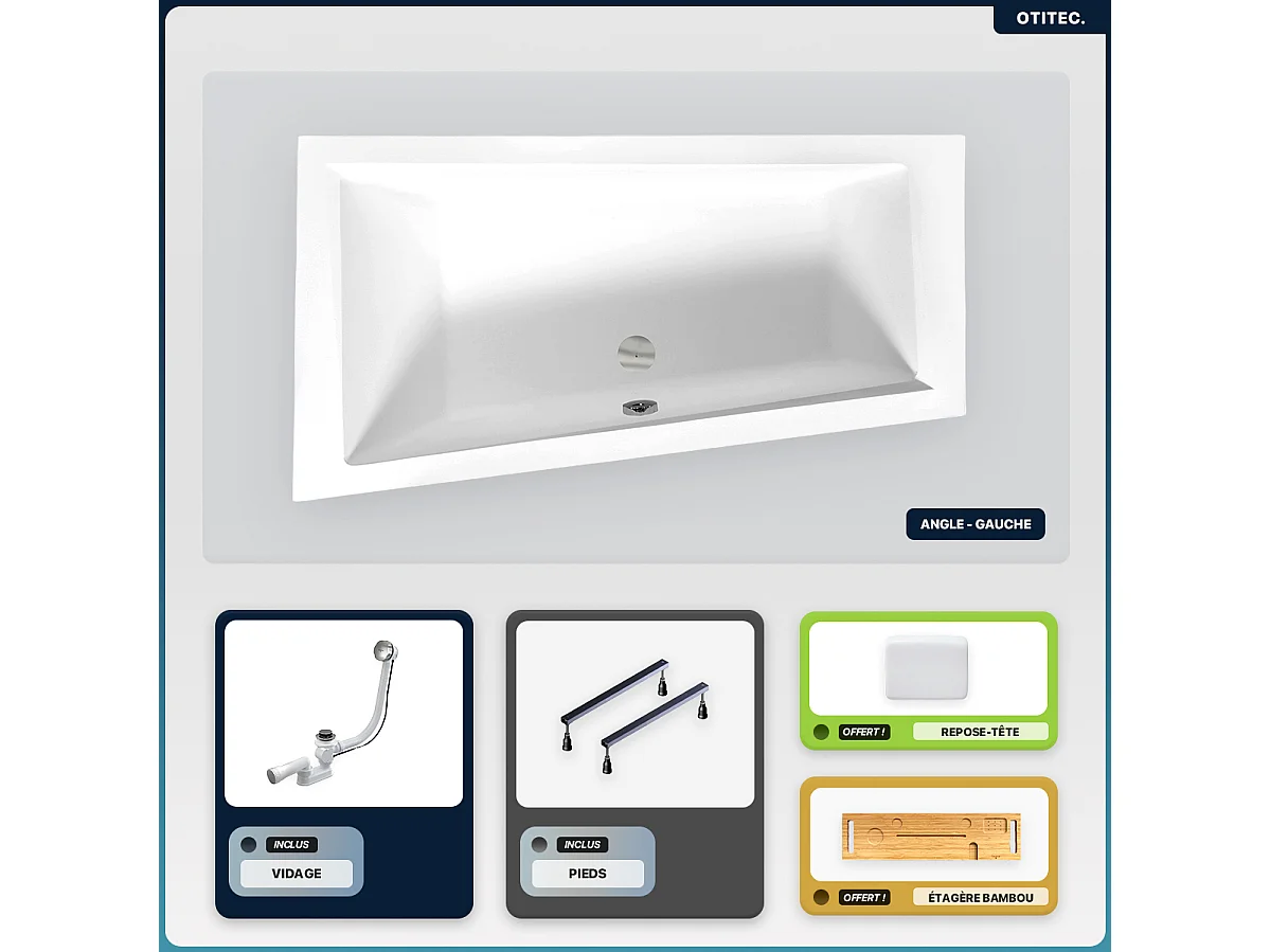 Baignoire asymétrique - 150 x 85 cm - Gauche - sans Habillage - avec Pieds - Repose-tête - Étagère bambou - Vidage Chrome - INTIMA