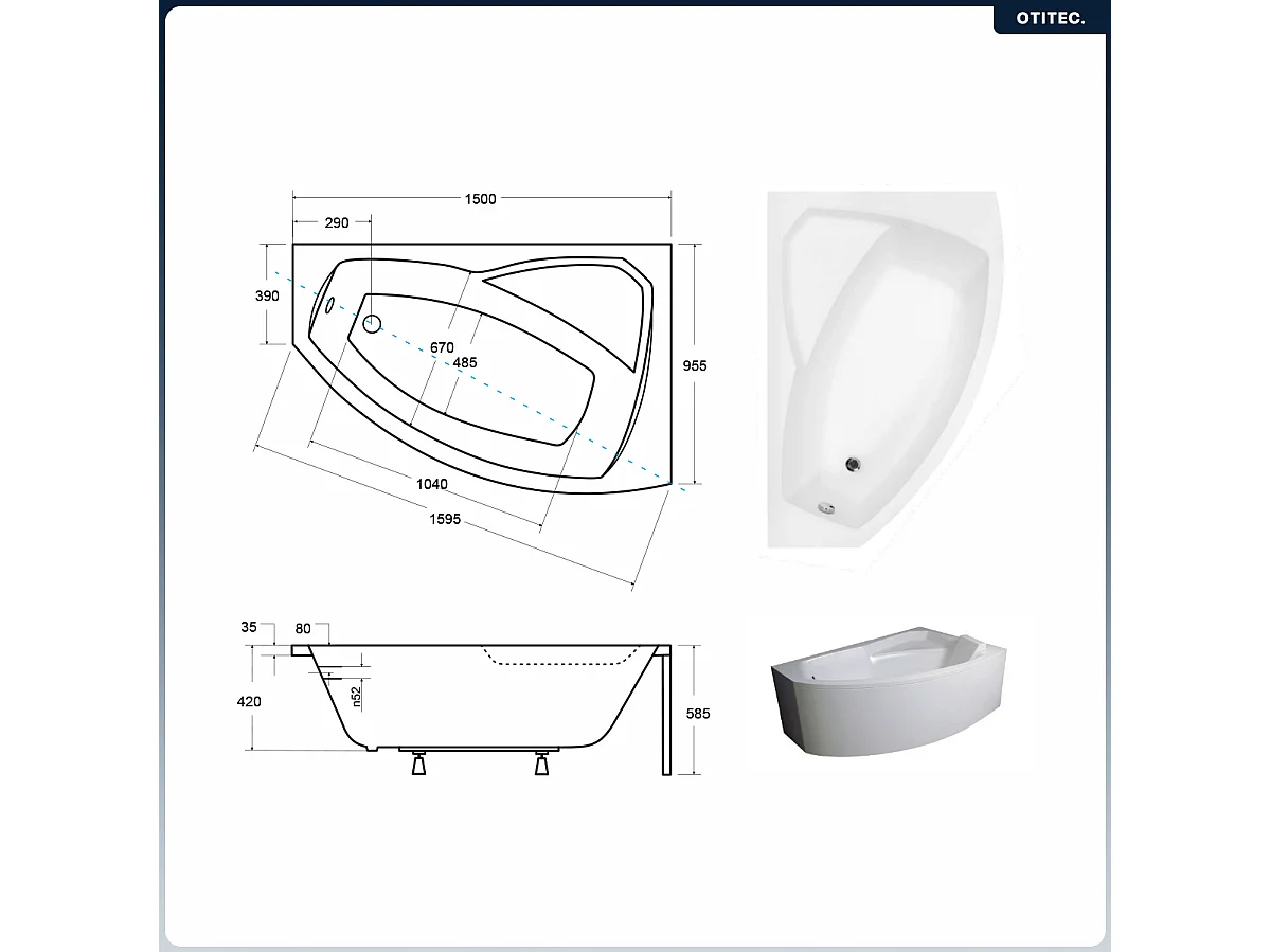 Baignoire asymétrique - 150 x 95 cm - Droite - sans Habillage - avec Pieds - Vidage Chrome - RIMA