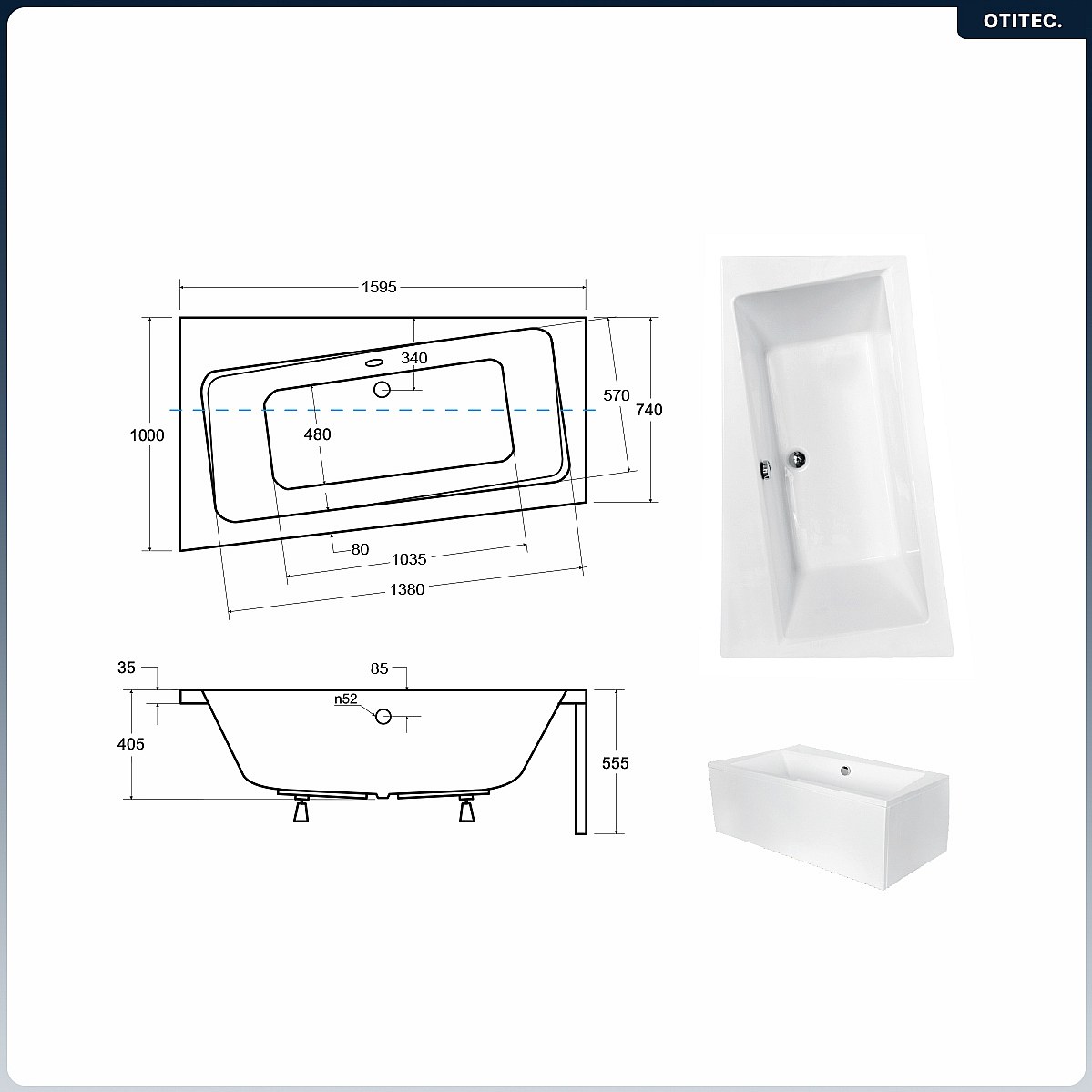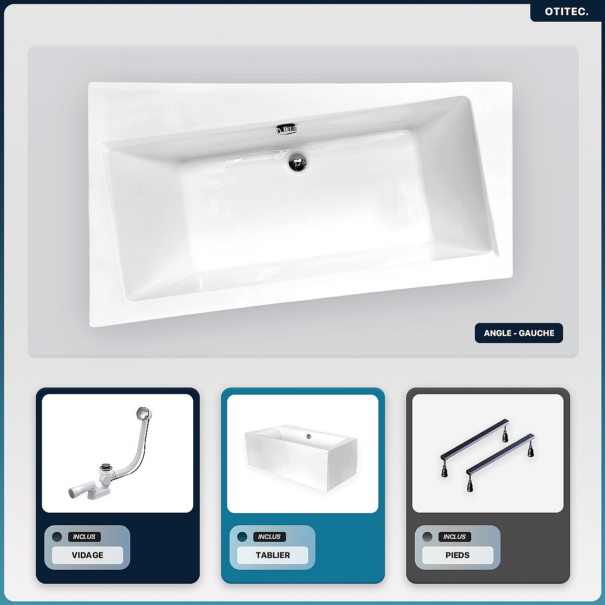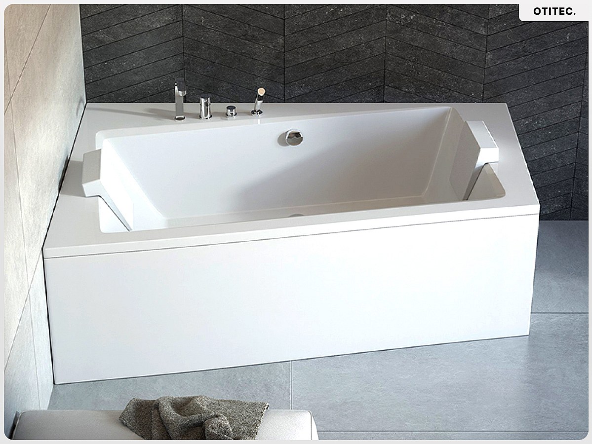 Baignoire asymétrique - 160 x 100 cm - Gauche - avec Tablier Blanc - Pieds - Vidage Chrome - INFINITY