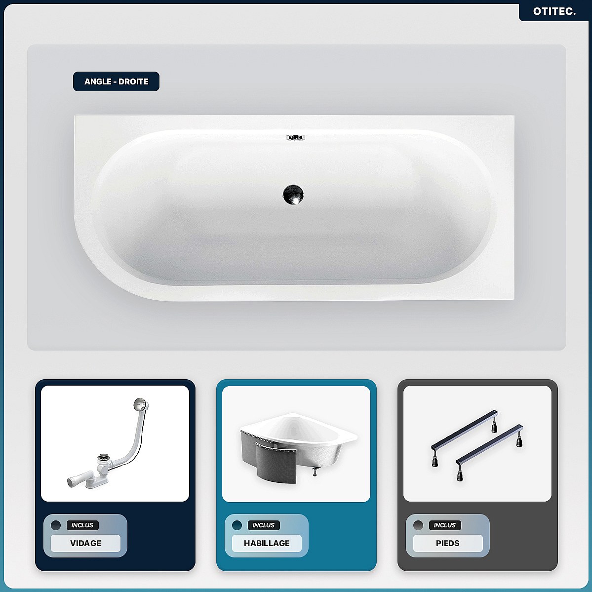 Baignoire asymétrique - 160 x 75 cm - Droite - avec Habillage - Pieds - Vidage Chrome - AVITA