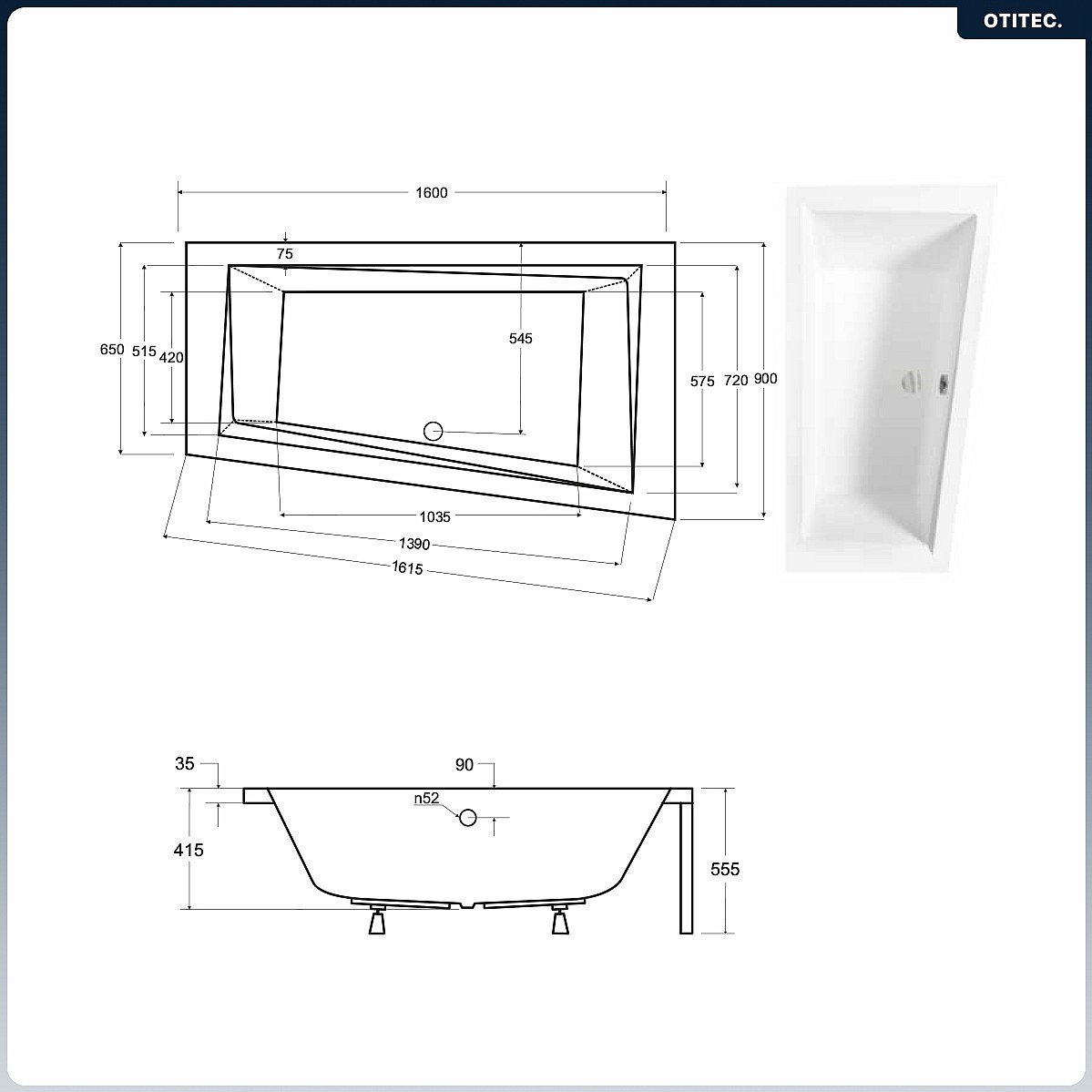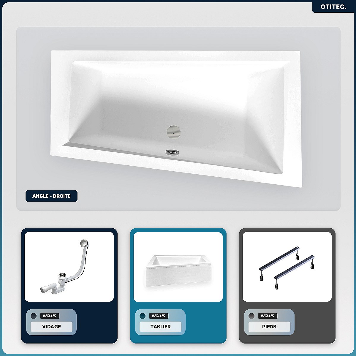 Baignoire asymétrique - 160 x 90 cm - Droite - avec Tablier - Pieds - Vidage Chrome - INTIMA