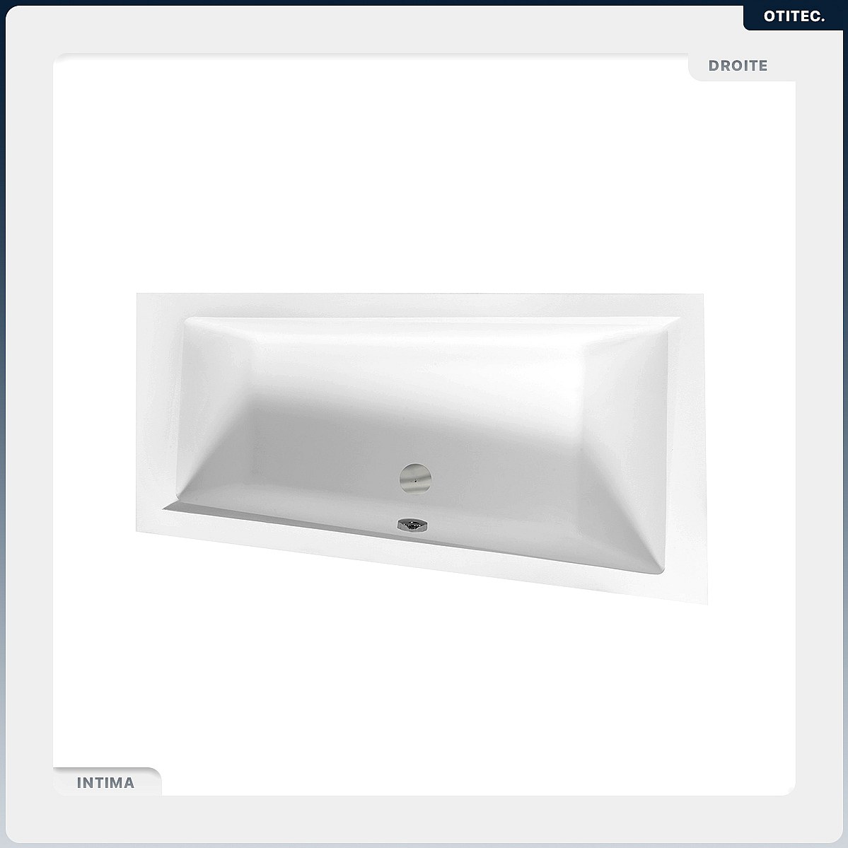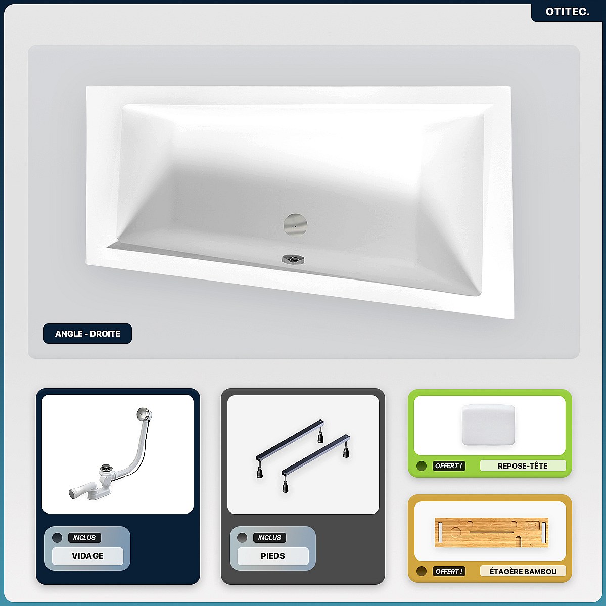 Baignoire asymétrique - 160 x 90 cm - Droite - sans Habillage - avec Pieds - Repose-tête - Étagère bambou - Vidage Chrome - INTIMA