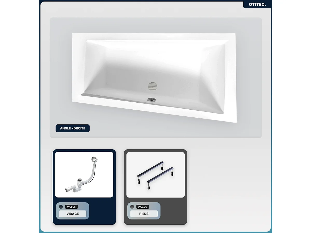 Baignoire asymétrique - 160 x 90 cm - Droite - sans Habillage - avec Pieds - Vidage Chrome - INTIMA