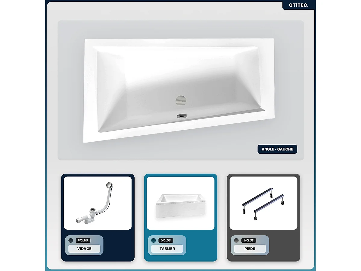 Baignoire asymétrique - 160 x 90 cm - Gauche - avec Tablier - Pieds - Vidage Chrome - INTIMA