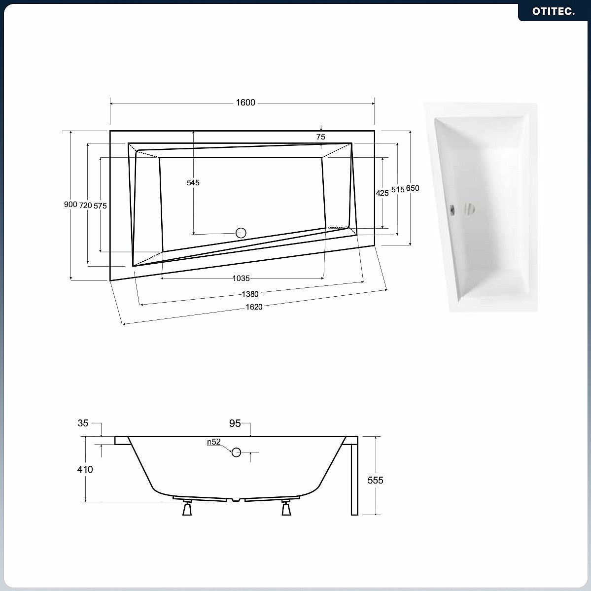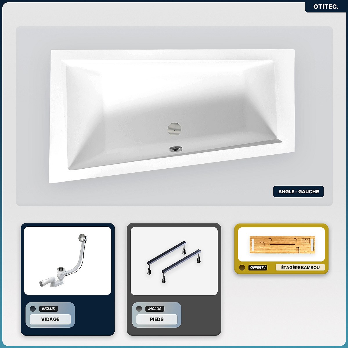 Baignoire asymétrique - 160 x 90 cm - Gauche - sans Habillage - avec Pieds - Étagère bambou - Vidage Chrome - INTIMA