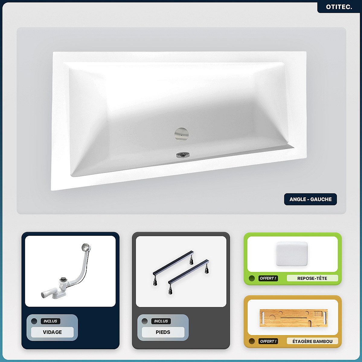Baignoire asymétrique - 160 x 90 cm - Gauche - sans Habillage - avec Pieds - Repose-tête - Étagère bambou - Vidage Chrome - INTIMA